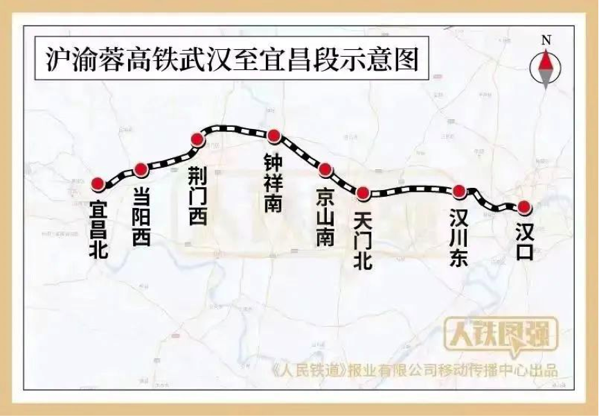 The design rendering of Yichang North Railway Station.The Wuyi (Wuhan-Yichang) section is designed to run at a speed of 350 kilometers per hour. It starts from Hankou Railway Station and ends at Yichang North Railway Station. There are 6 stations along the route: Hanchuan East, Tianmen North, Jingshan South, Zhongxiang South, Jingmen West and Dangyang West. The Wuyi section will take 4 years to complete with a total investment of 5.27 billion yuan (US$7.4 billion). Since construction began on September 25, 2021, more than 80% of the roadbed filling and about 70% of the tunnel construction has been completed.