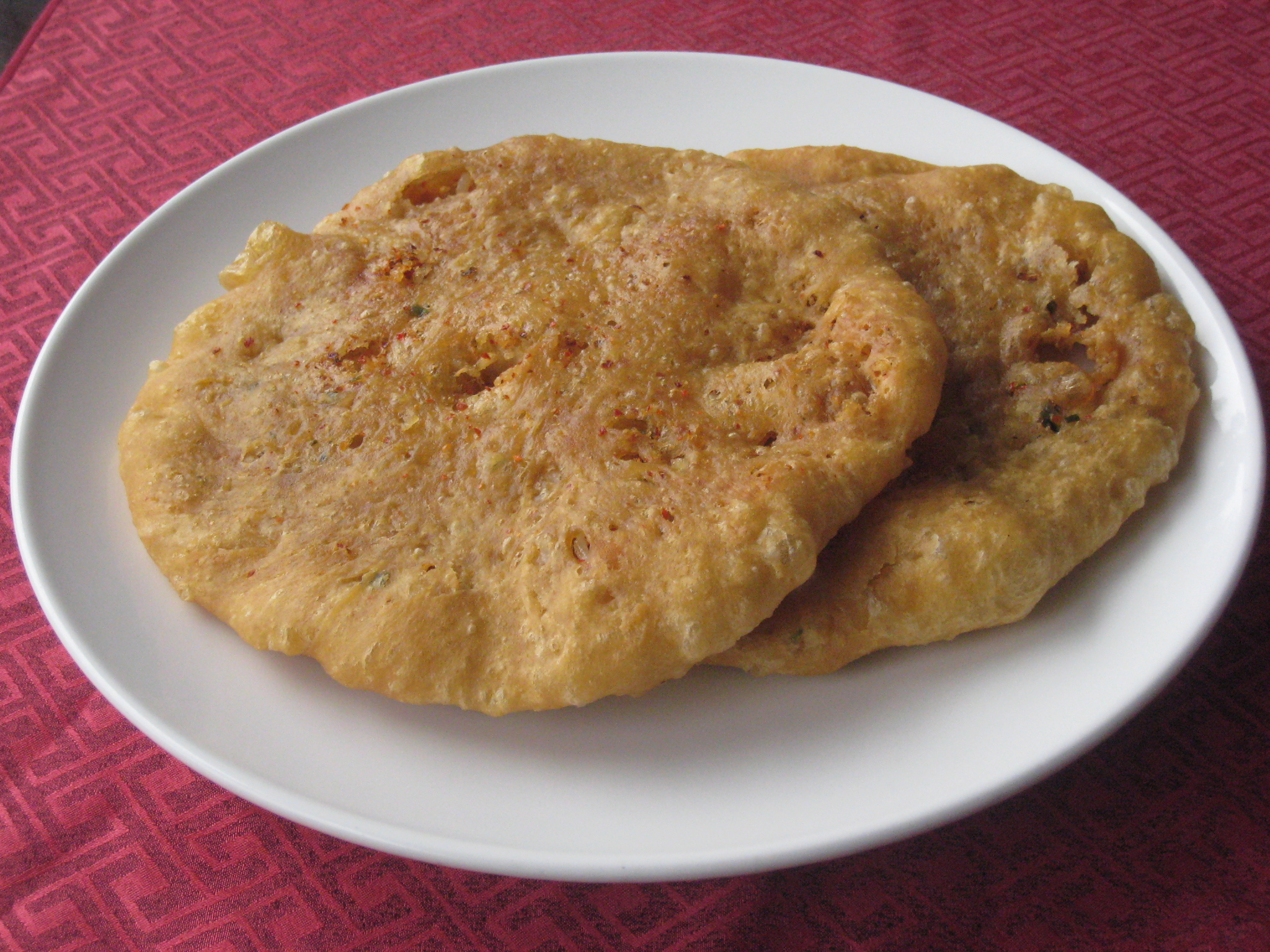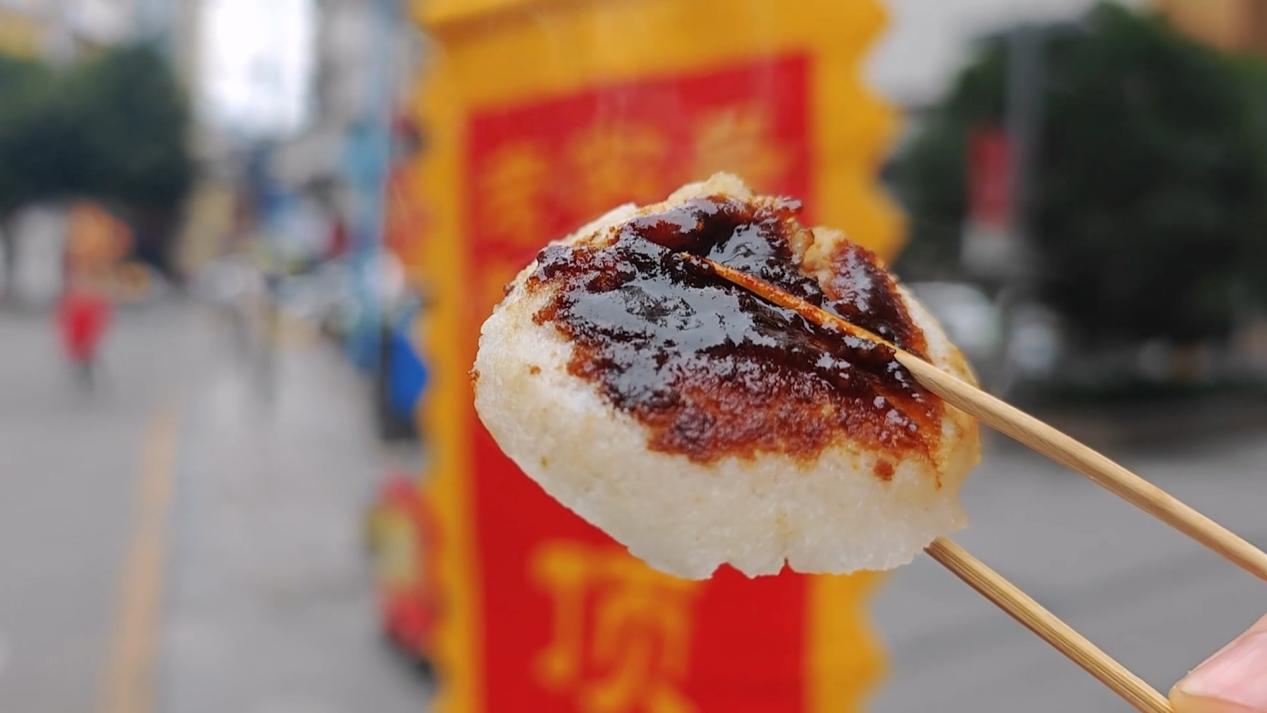 Deep-fried until golden brown, these pancakes are made from steamed glutinous rice mixed with salt, pepper, chili powder, and minced ginger to form a sticky rice cake (Ciba糍粑). The Ciba is then wrapped with fermented dough, rolled into a flat disc shape, and punctured with a knife in the center to prepare for frying.