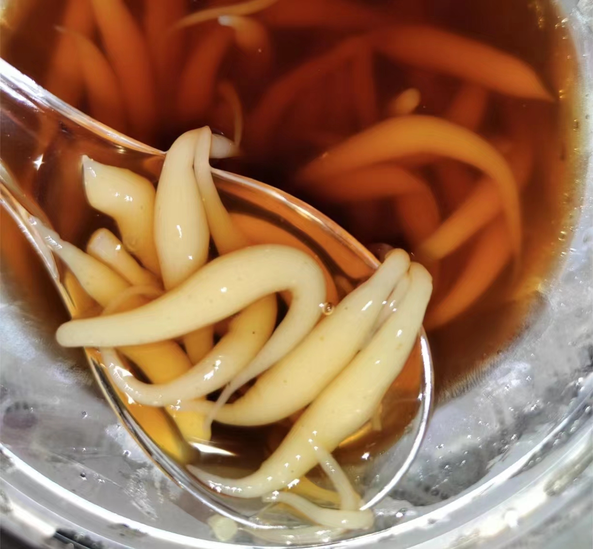 This smooth, refreshing, soft, and sweet dish commonly found in Yichang, is made by draining rice pulp through a colander into a basin of cool water. The snack gets its name from its thin “head and tail,” resembling a shrimp. The jelly is often paired with brown sugar syrup.