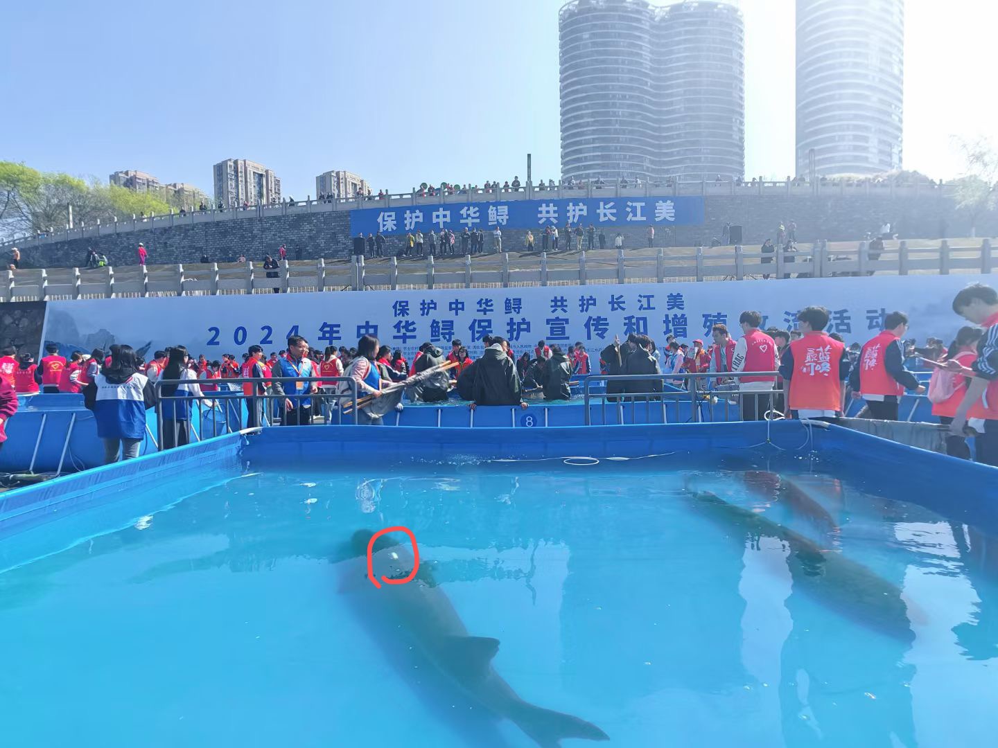 More than 200,000 Chinese sturgeons were released into the Yangtze River on March 28, 2024. Some of them were equipped with a new tracking device. The white module was securely attached to the backs of several large Chinese sturgeons. Developed by the 3D printing research and development team at China Three Gorges University, the module contains a tracking sonar device.