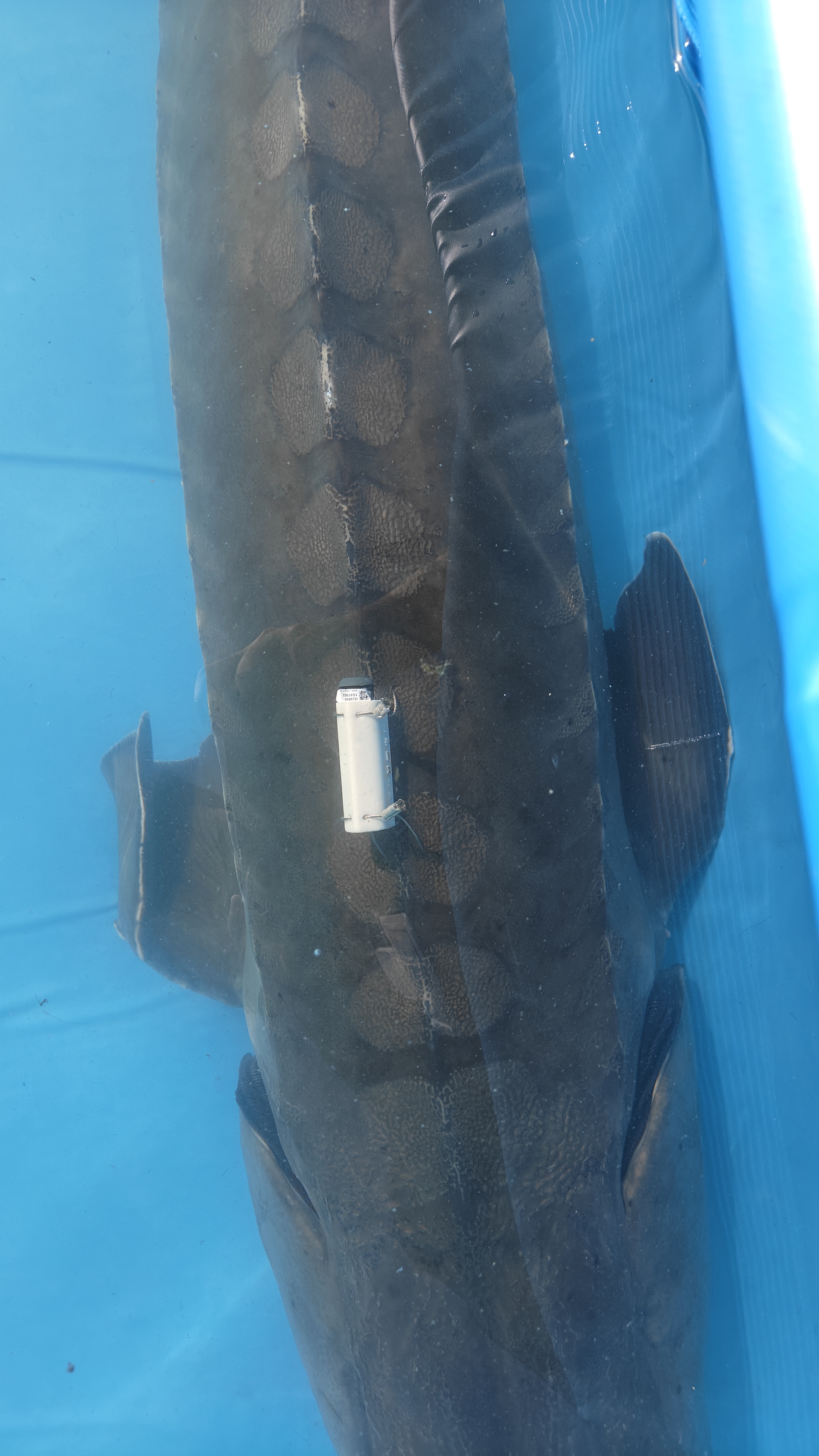 A Chinese sturgeon carries the module and tracking device on its back.