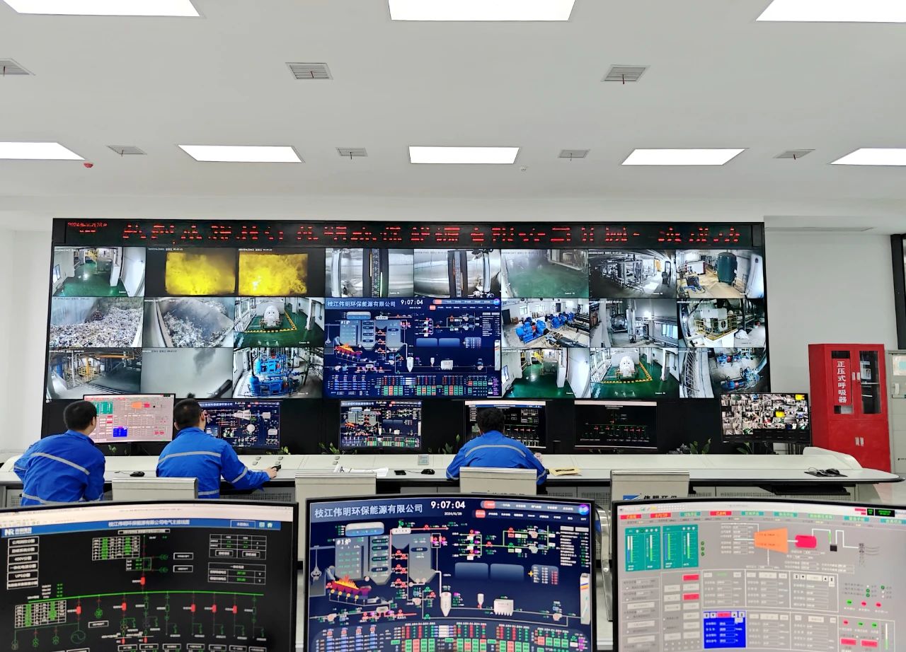 Technicians remotely control the operation of the incinerator boiler and other equipment in Zhijiang Waste-to-energy Plant.
