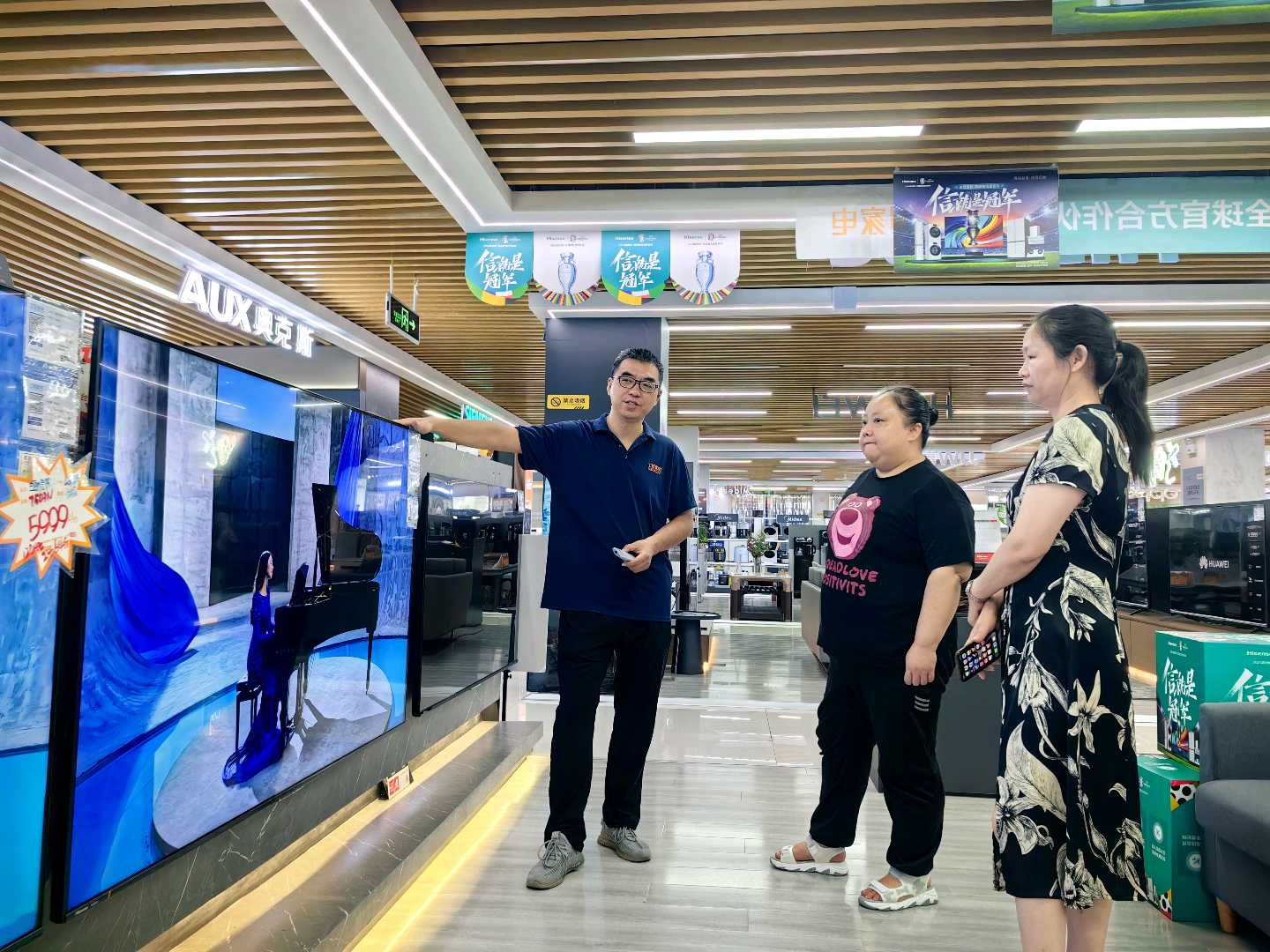 At Wuhan Industrial & Trade Co., Ltd. Household Appliances Yichang International Trade Store, Hisense's 100-inch E8N Ultra model has become a favorite among players for its ability to support three major types of consoles and deliver optimal picture quality through upgrades in the screen, chip, Mini LED and AI technology. Customers can get a 2,000-yuan discount on this TV under the trade-in policy, making it an affordable choice. Saleswoman Ms. Zhou said she has had a significant number of consumer inquire about the TV.