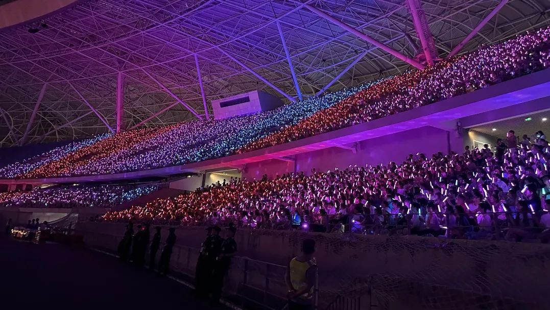 Fans wave glow sticks, transforming the stadium into a mesmerizing sea of light.