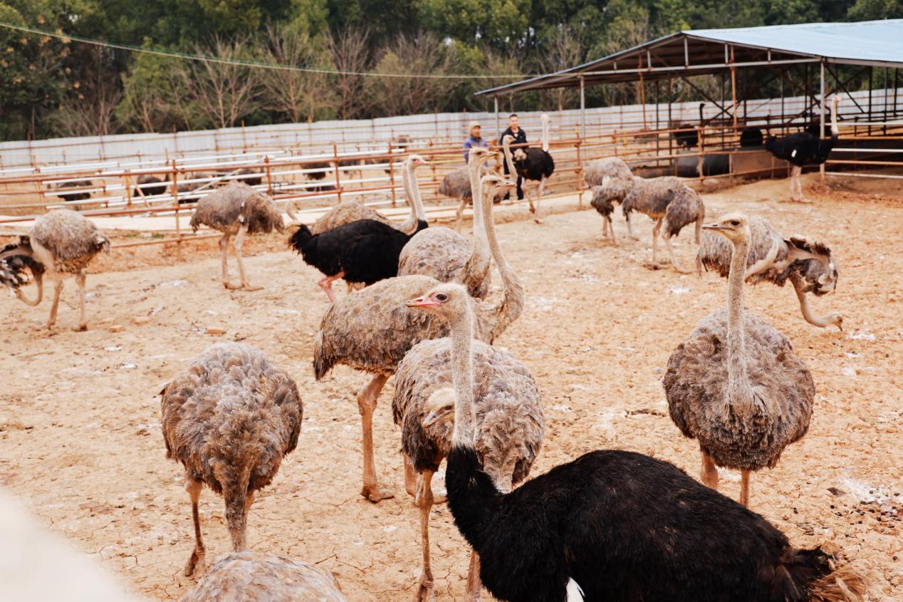 <caption> Ostrich farm in Yiling District.Tech innovation drives every link of the agricultural chain. Smart aquaculture systems fine-tune eel habitats in real time, while Douyin livestreams turn viewers into buyers. The ostrich brand exemplifies commercial savvy, supported by government-research alliances tackling technical hurdles—from water purification to equipment modernization.