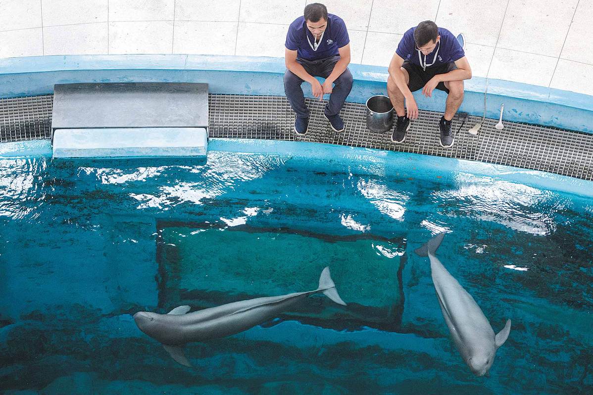 Staff members watch Yangtze finless porpoises at the aquarium in Wuhan, Hubei province, on June 29. XIAO YIJIU/WU ZHIZUN/XINHUA