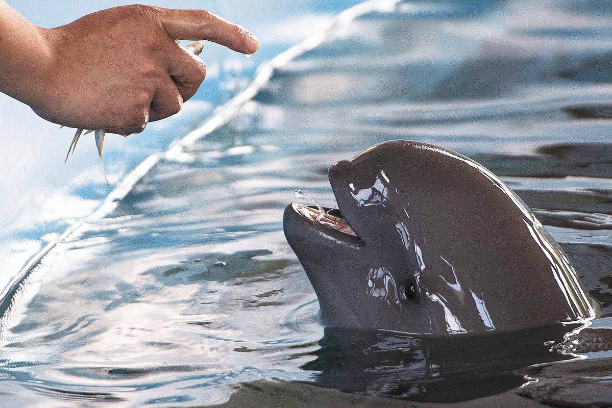 A trainer feeds the finless porpoise “F9C22” at the aquarium in Wuhan, Hubei province, on July 5. XIAO YIJIU/WU ZHIZUN/XINHUA