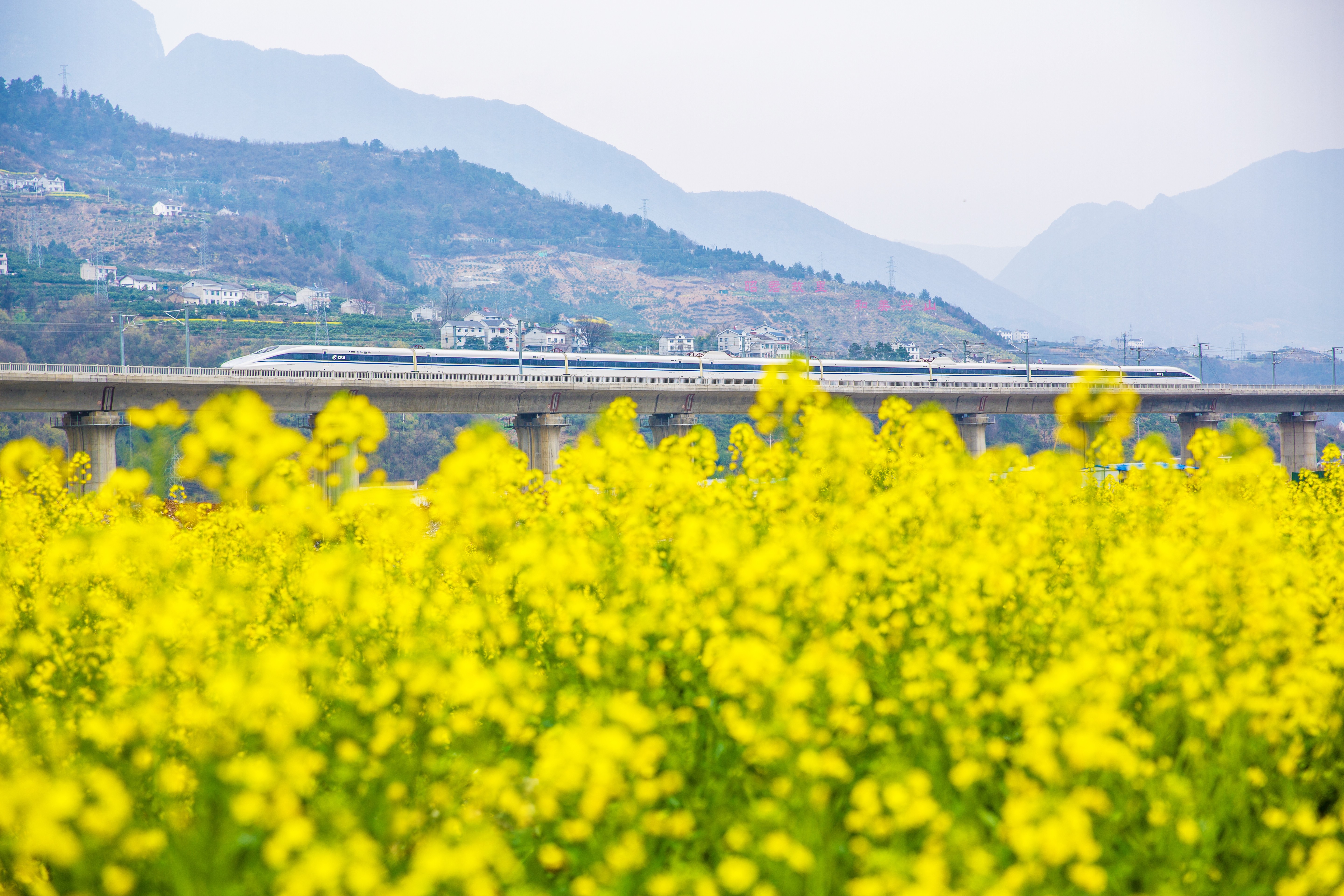 On the train to spring! Rapeseed, plum blossoms and magnolia are in full bloom near the Xingshan section of the Zhengzhou-Wanzhou high-speed railway. Bullet trains speed past a sea of flowers, forming a colorful picture of spring beauty.