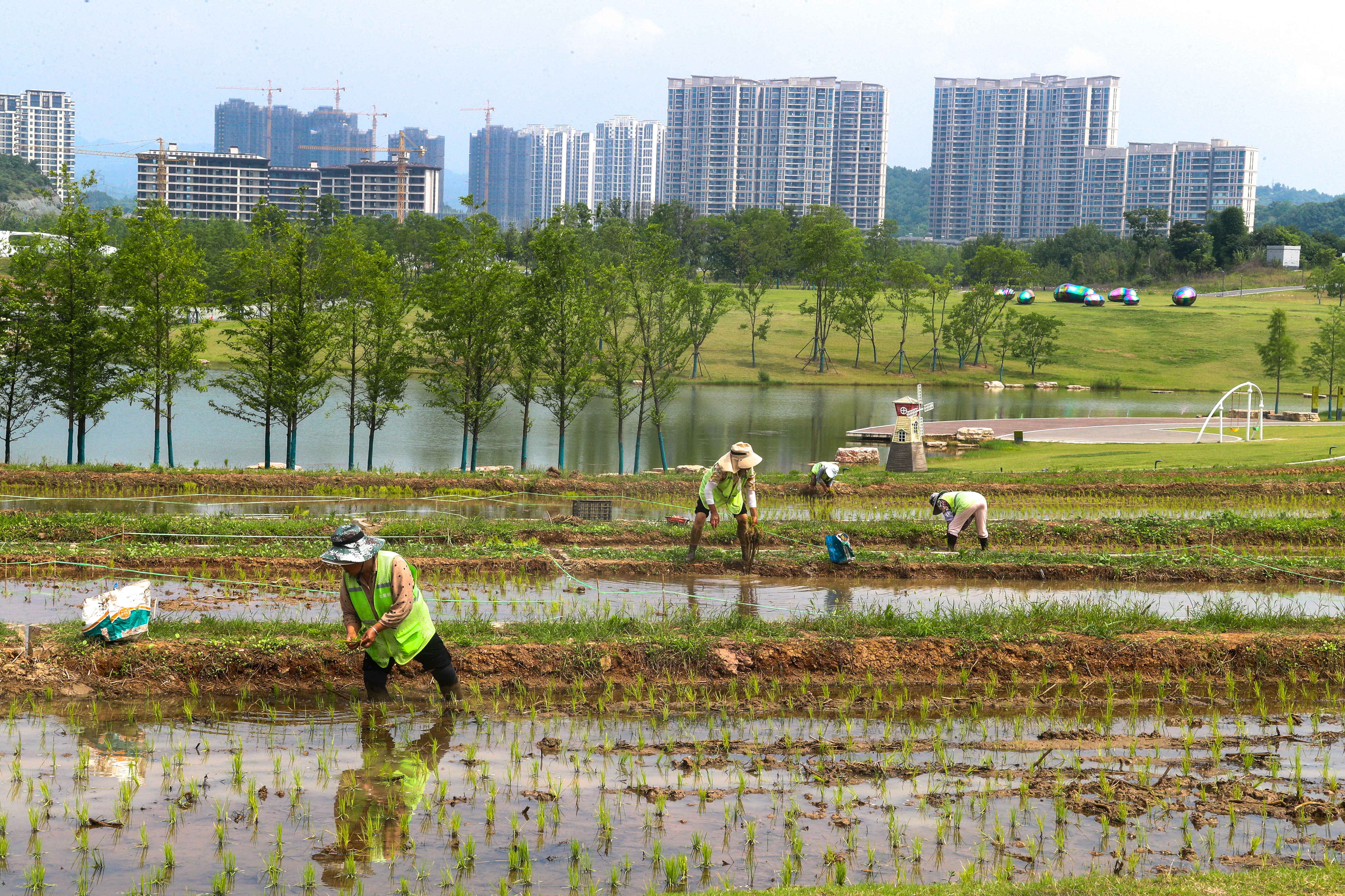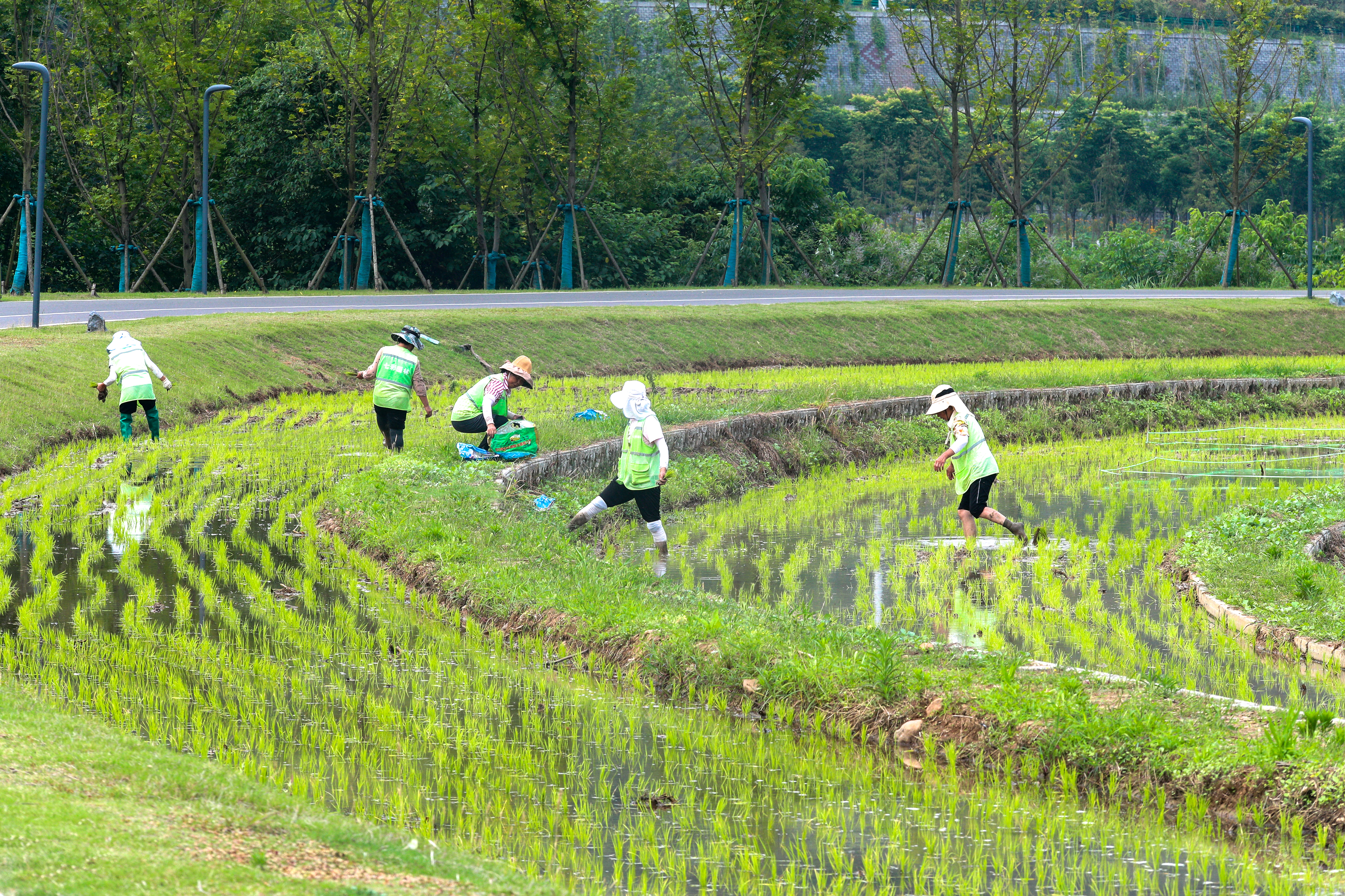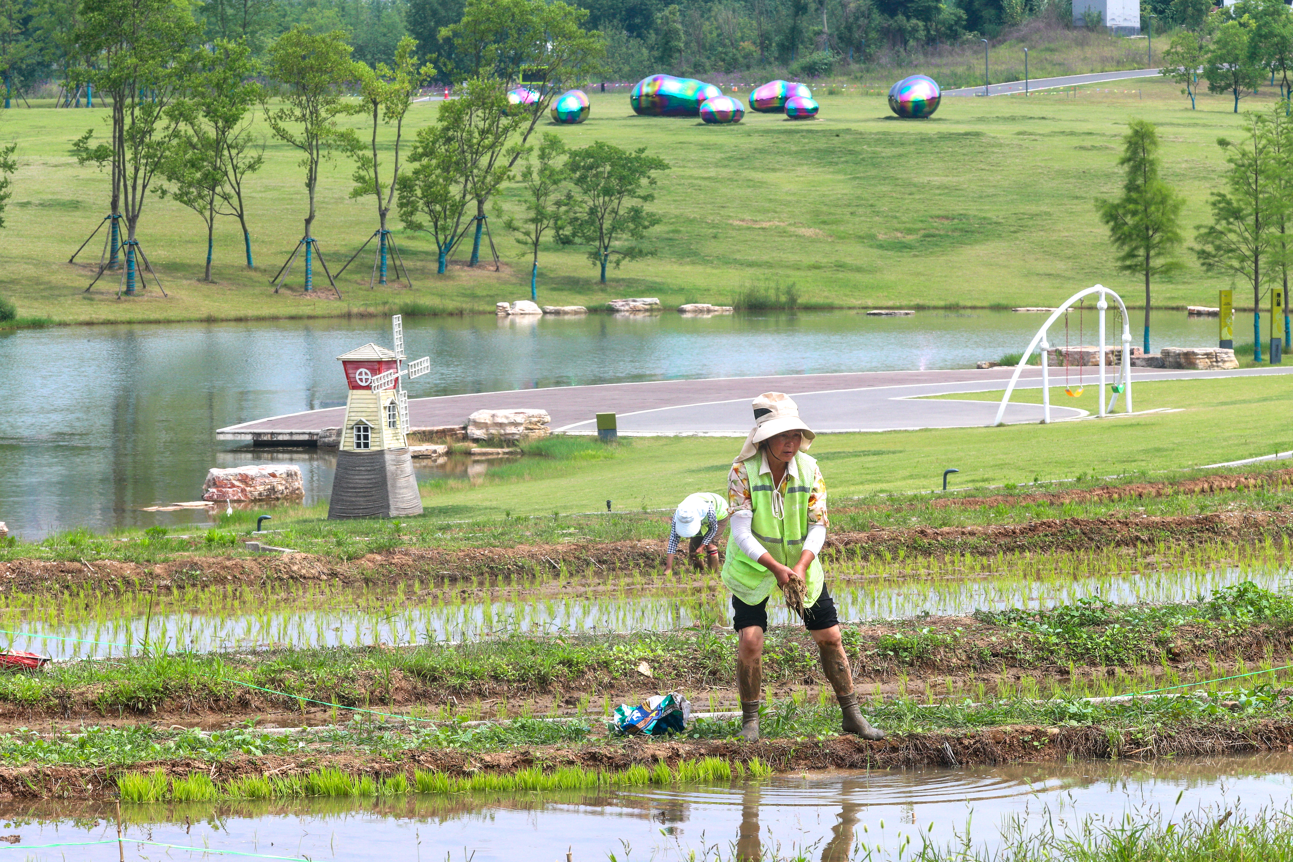 On June 11, gardeners were planting young seedlings in the rice paddies of Juanqiaohe Wetland Park.