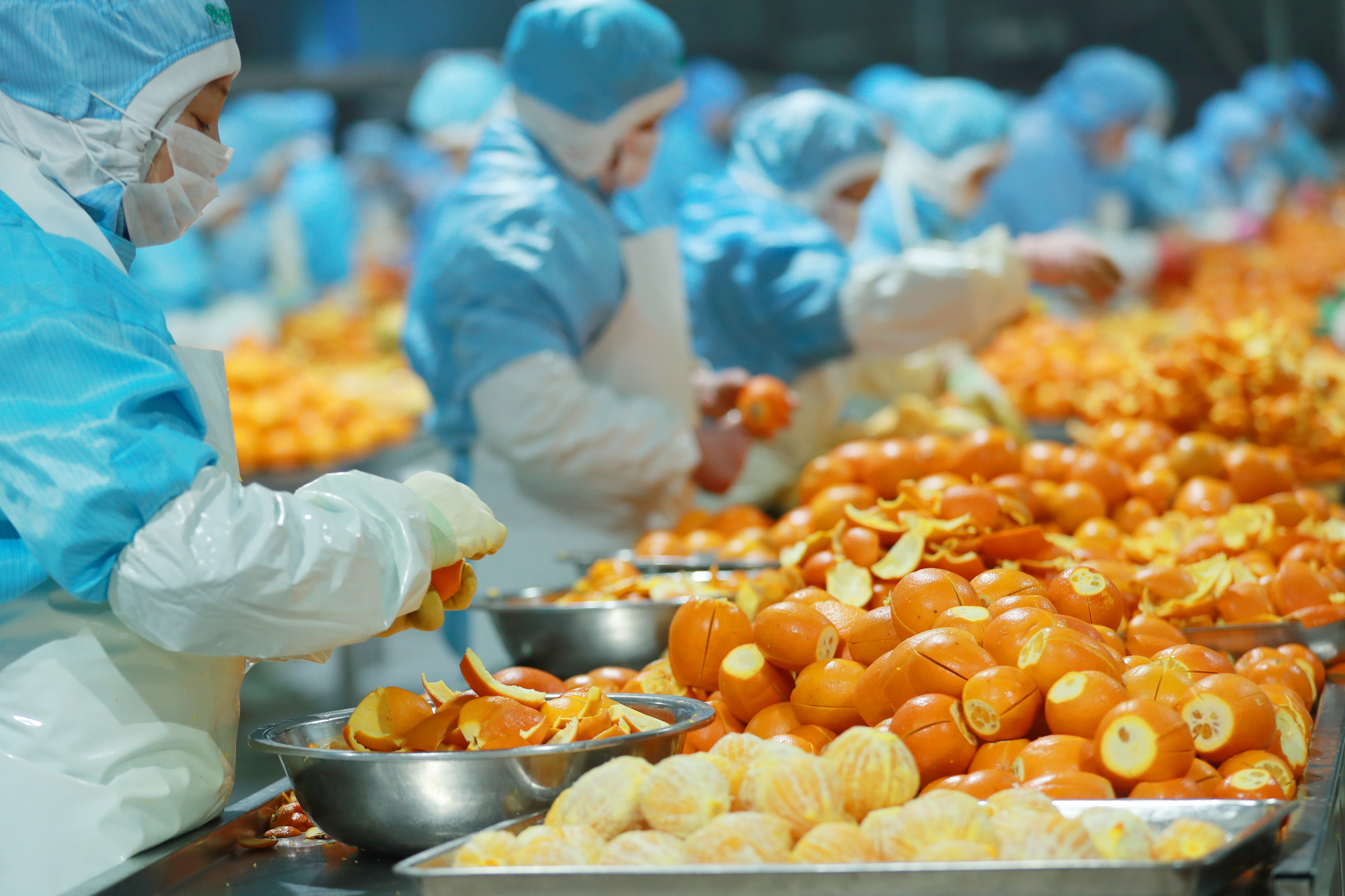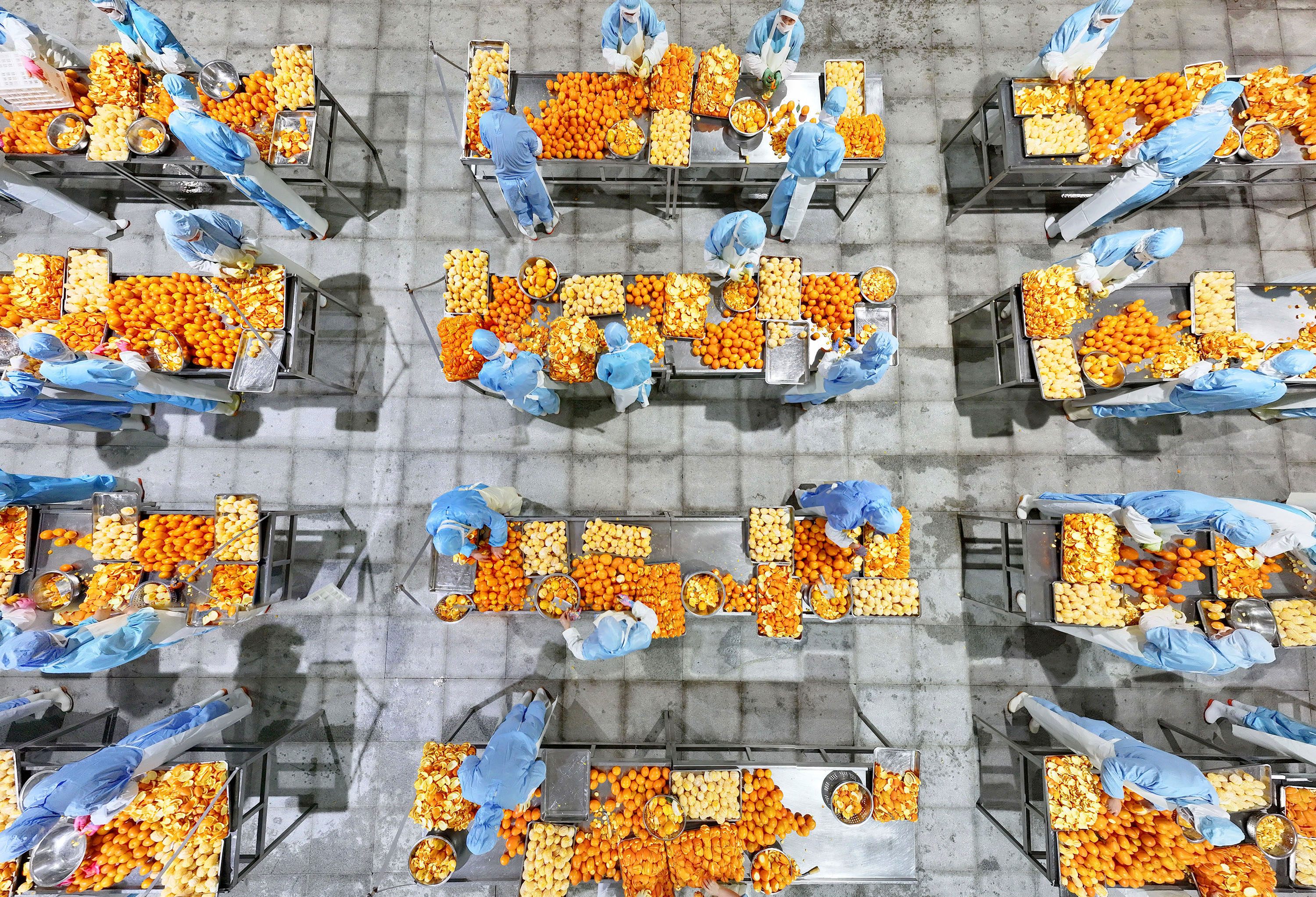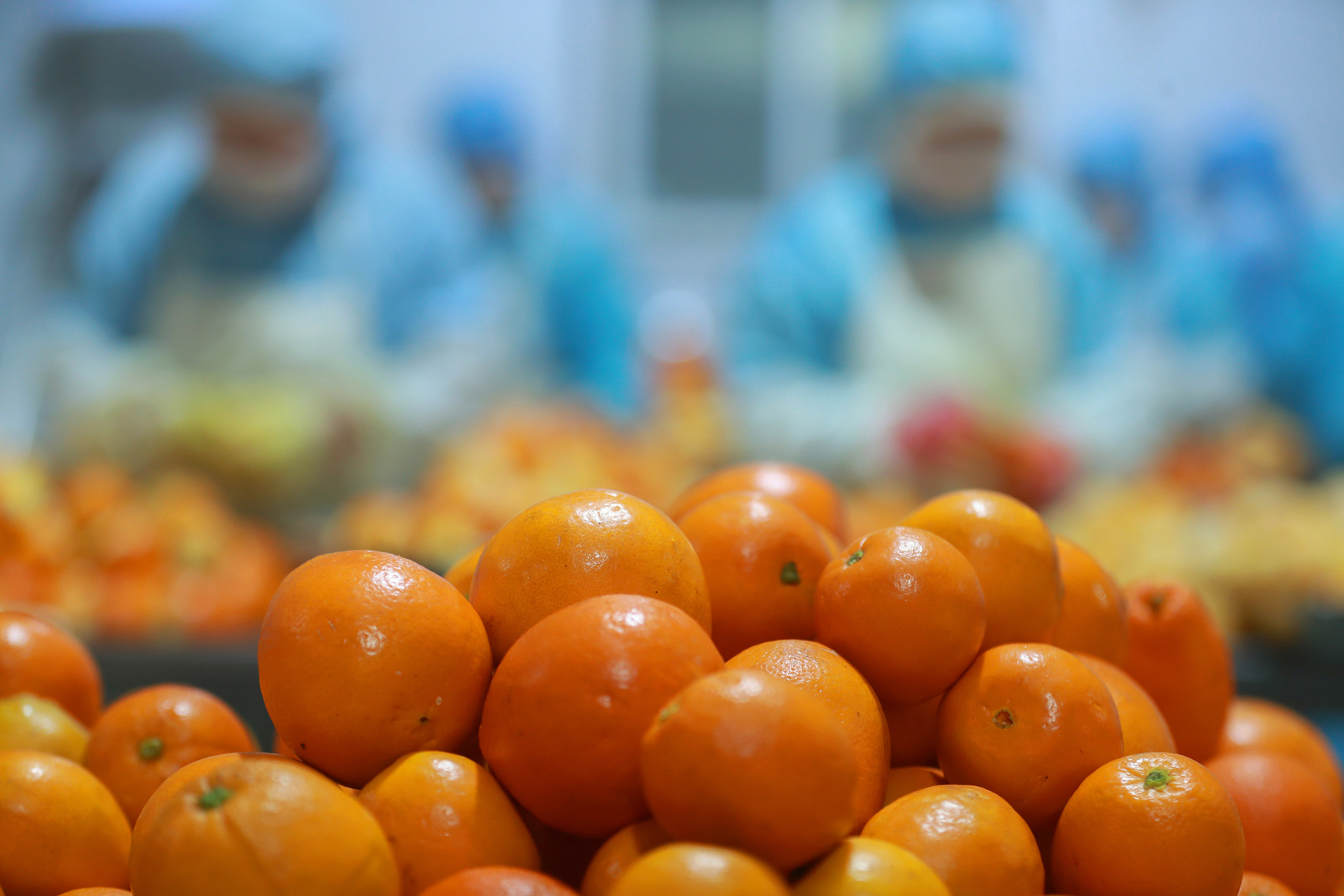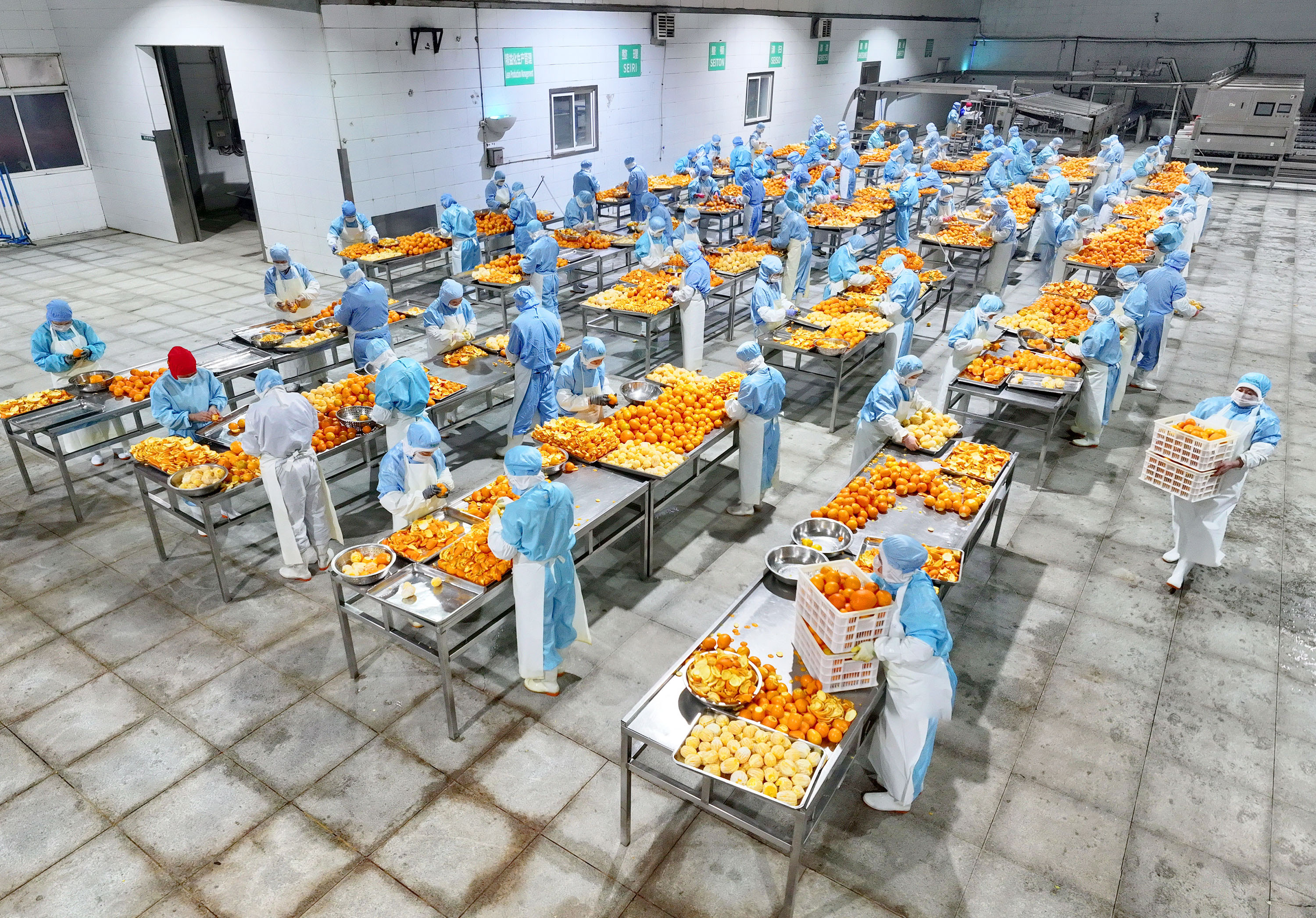 Workers busy at the orange processing workshop of Qugu International Agriculture Group. (Photo by Wang Gang)