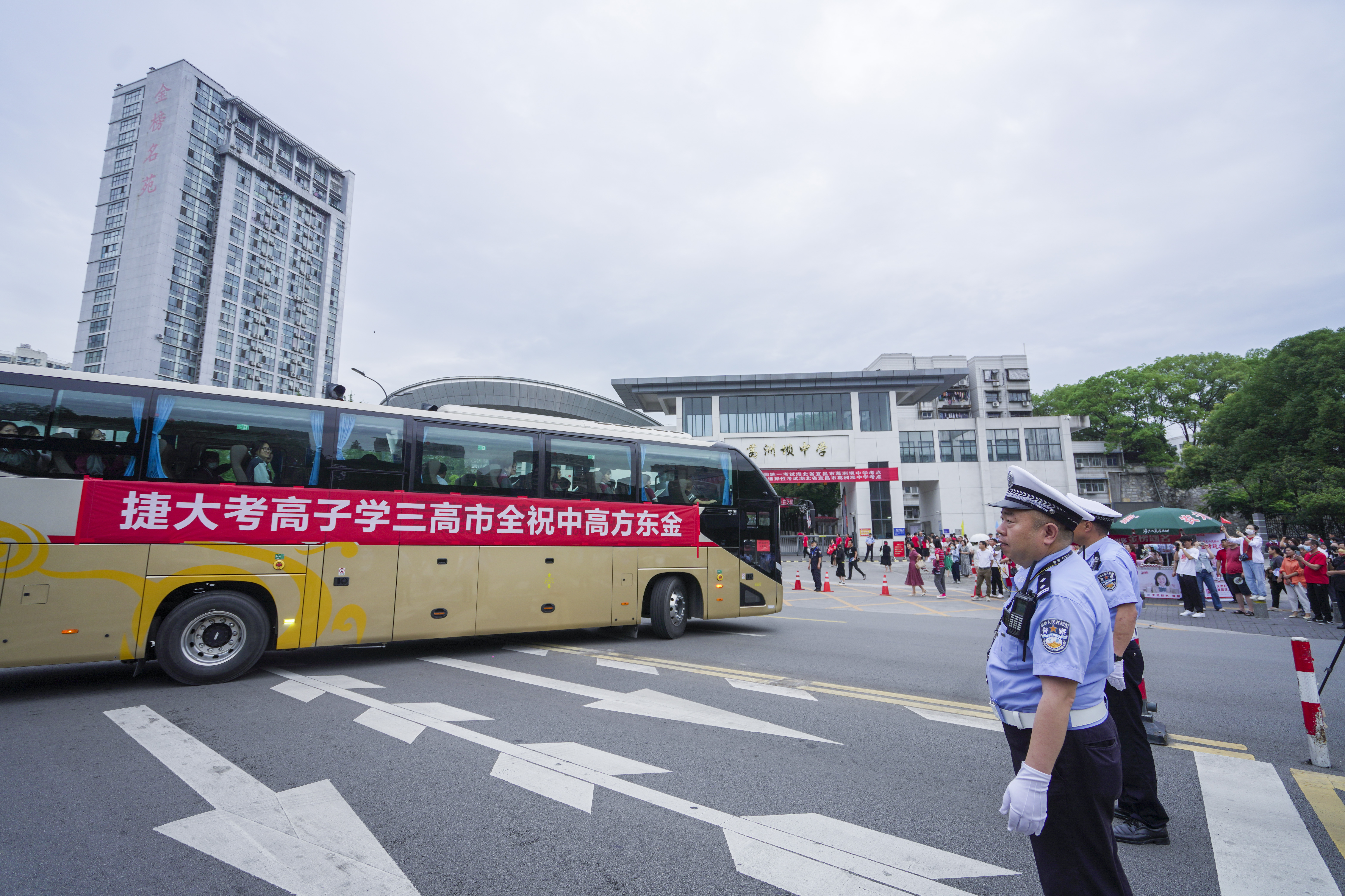 Traffic Police officers maintain a smooth flow of traffic at the exam site of Yichang Gezhouba Senior Middle School.