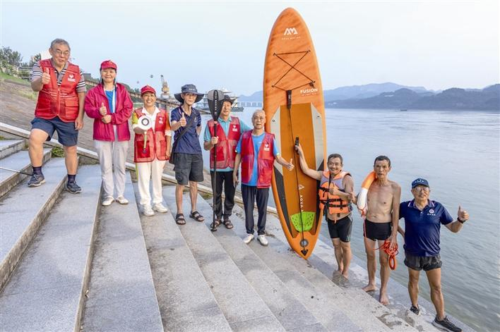 Zhao (third from right) leads the Yangfan Water Rescue Team. Photo by Fu Beibei.Currently, the rescue team boasts more than 50 members. They organize patrols and other volunteer activities along the Yichang River.