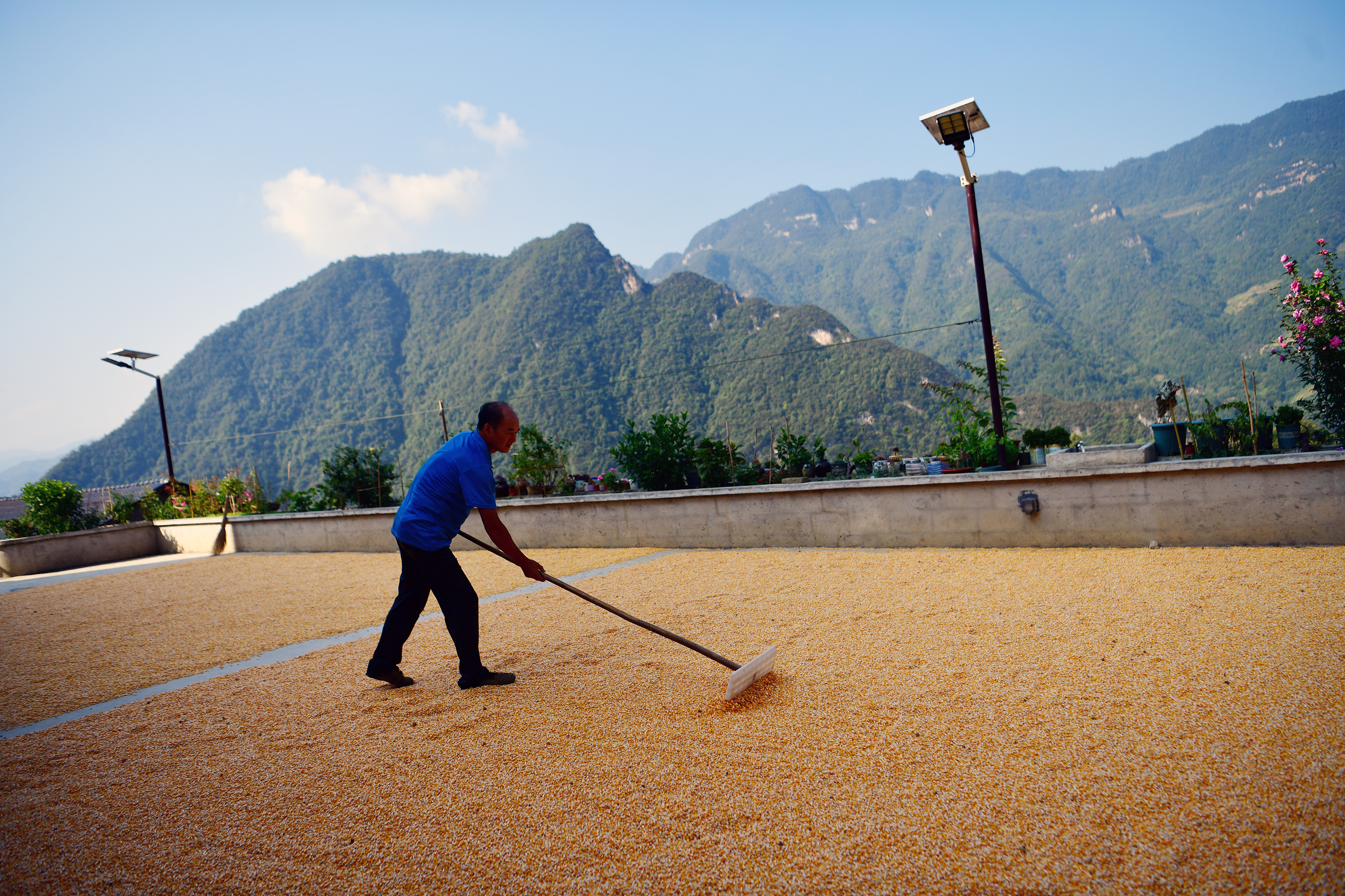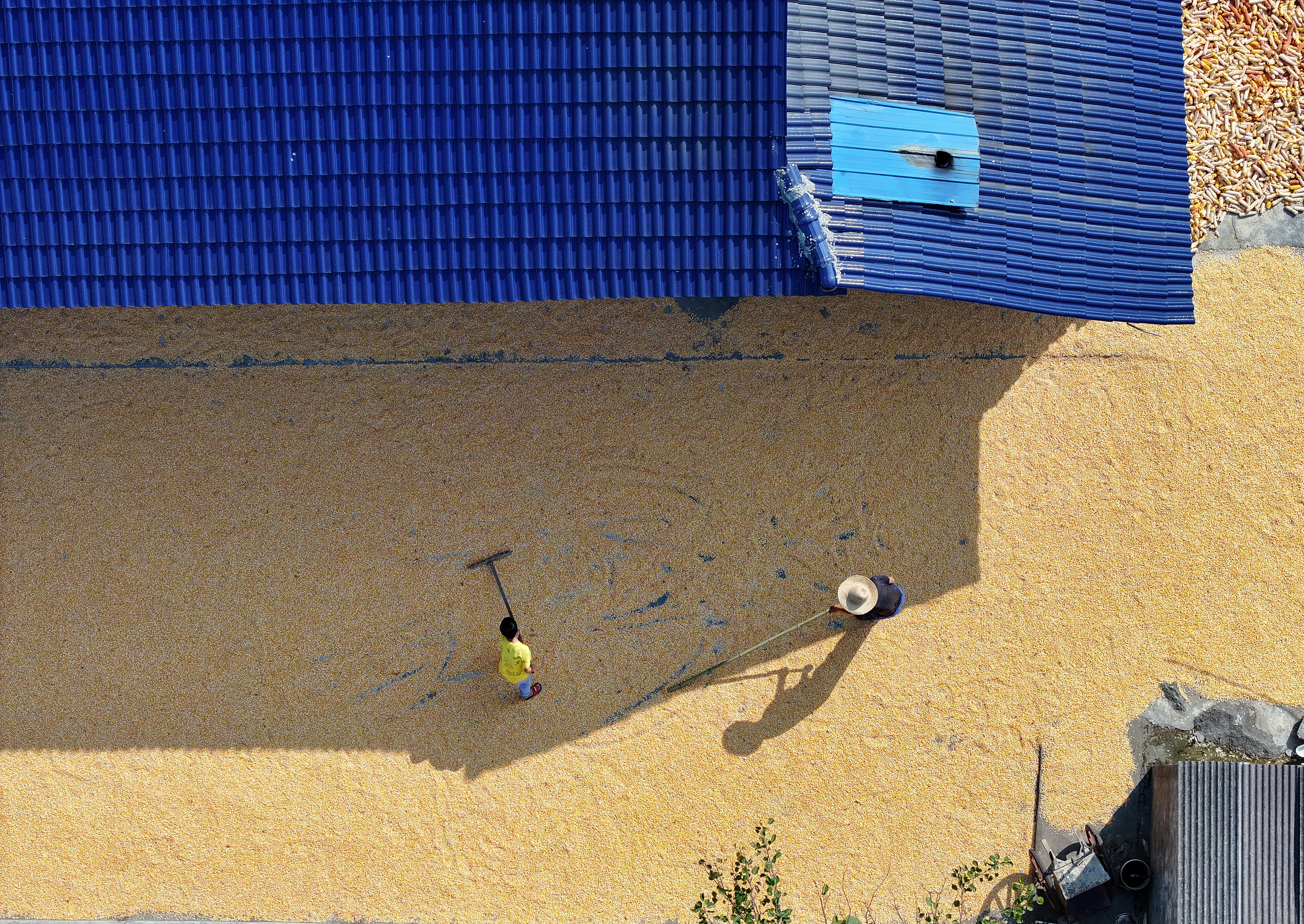 Local farmers are busy drying their harvest in Chuanxindian village. With the arrival of autumn, villager's courtyards come alive with the vibrant hues of golden corn.