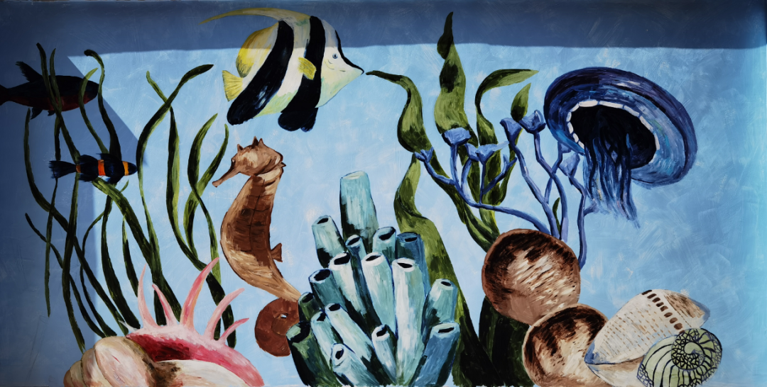 Song Xuanqi, a high school graduate who happened to have ample free time after the college entrance exam, contributed to the outline of fish and seaweed on the wall. Wang Junjie, a community member, was responsible for mixing the colors, while others filled in the painting.