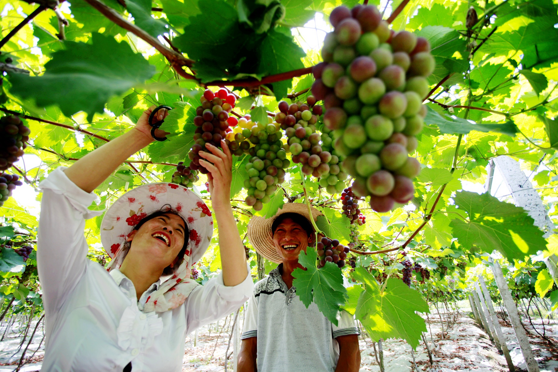 Villagers harvest grapes in a greenhouse in Sanhe Village.