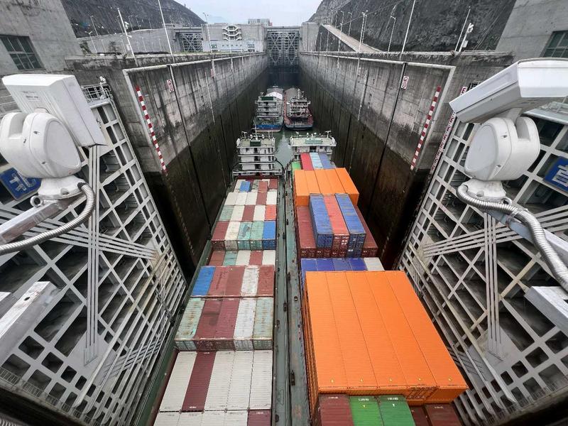 Vessels loaded with container cargo are passing through the Three Gorges Dam ship locks.