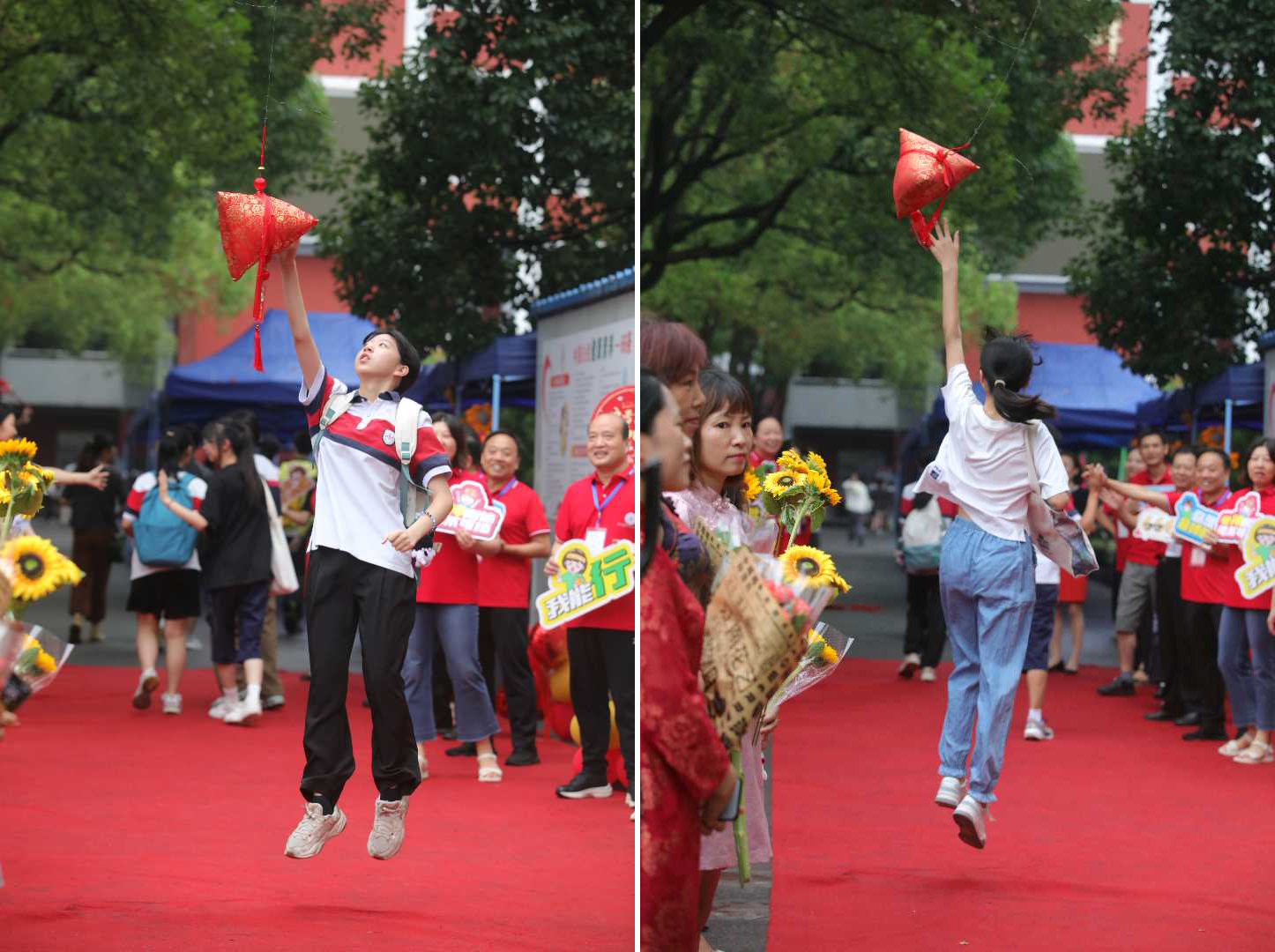 The students were welcomed with a red carpet and high-hanging rice dumplings, inviting them to jump and touch them upon entry. These rice dumplings, called "Gao Zong" (高粽), symbolize best wishes for the students' success in the exams, as its pronunciation is similar to “achieving high scores” and "being admitted into good schools” in Chinese.