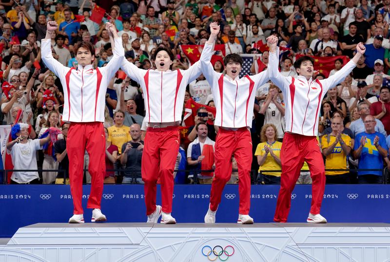 (From left to right) China's Xu Jiayu, Qin Haiyang, Sun Jiajun, and Pan Zhanle pose on the podium after winning the men's 4x100m medley relay final swimming event at the Paris 2024 Olympic Games on August 4, 2024.The men's 4x100m medley relay gold was won by them in 3 minutes, 27.46 seconds at the Paris 2024 Olympics on Sunday, surpassing the US team by more than 0.5 seconds. This victory put an end to the US team's 10 consecutive gold medal streak in the event since the 1984 Los Angeles Olympics.