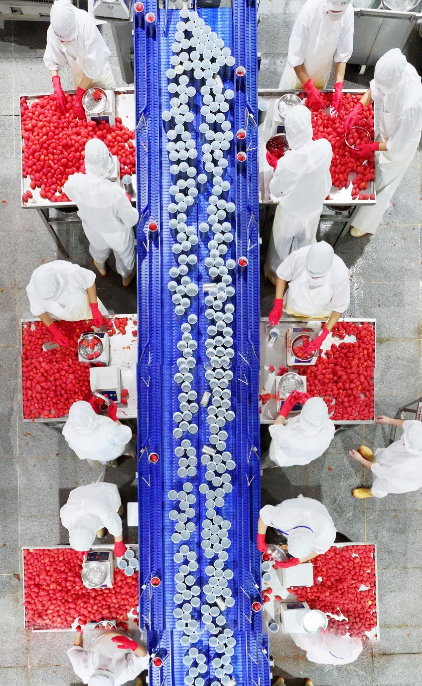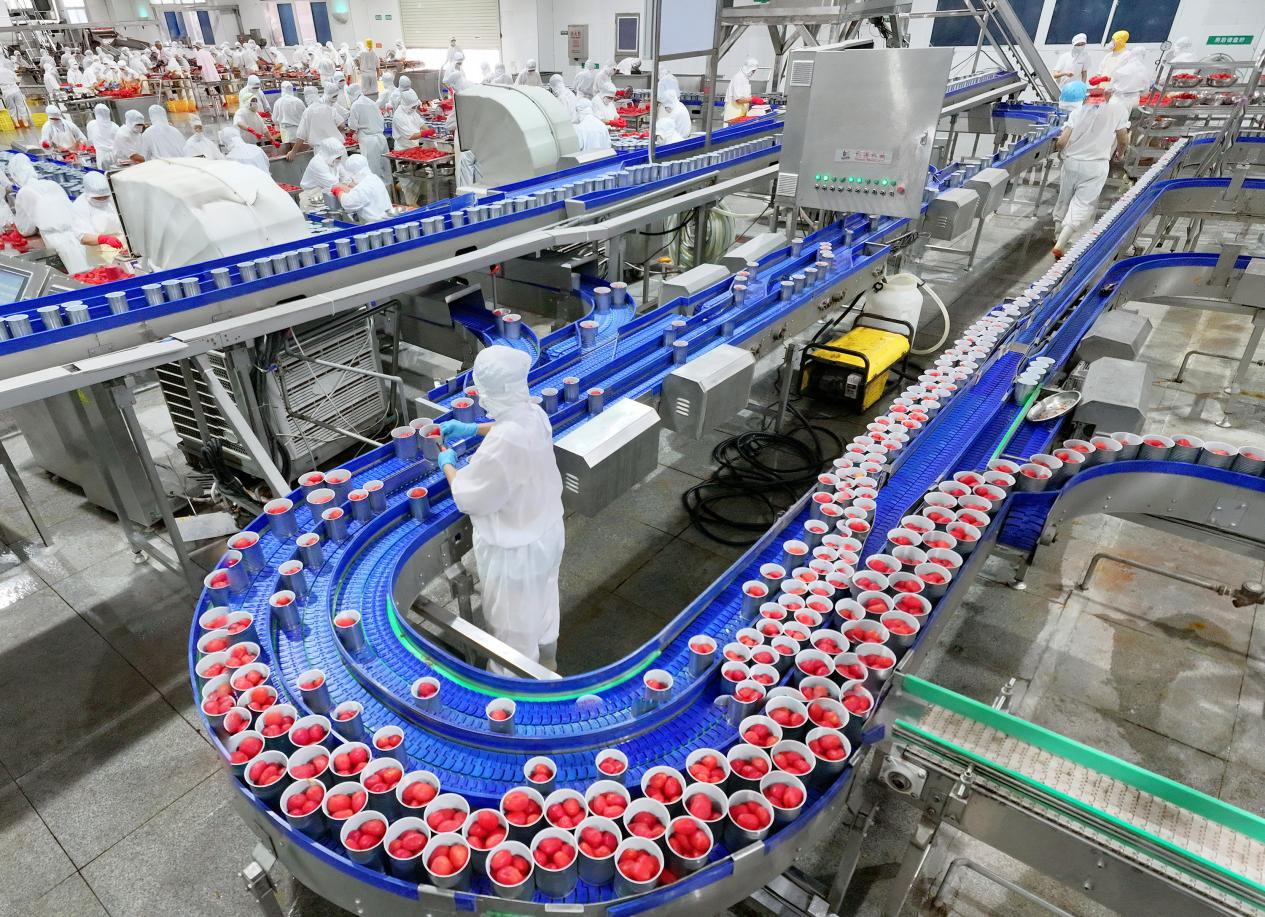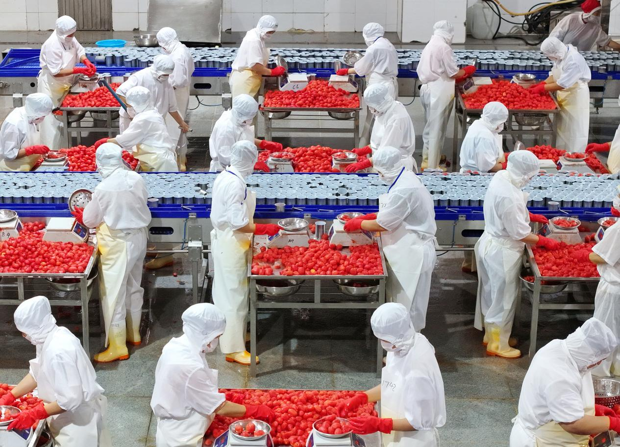 After a tomato harvest in Zigui County, workers from Qugu International Agriculture Group are processing and canning tomatoes and ketchup in the fruit and vegetable workshop. The resulting products will be exported to international markets.