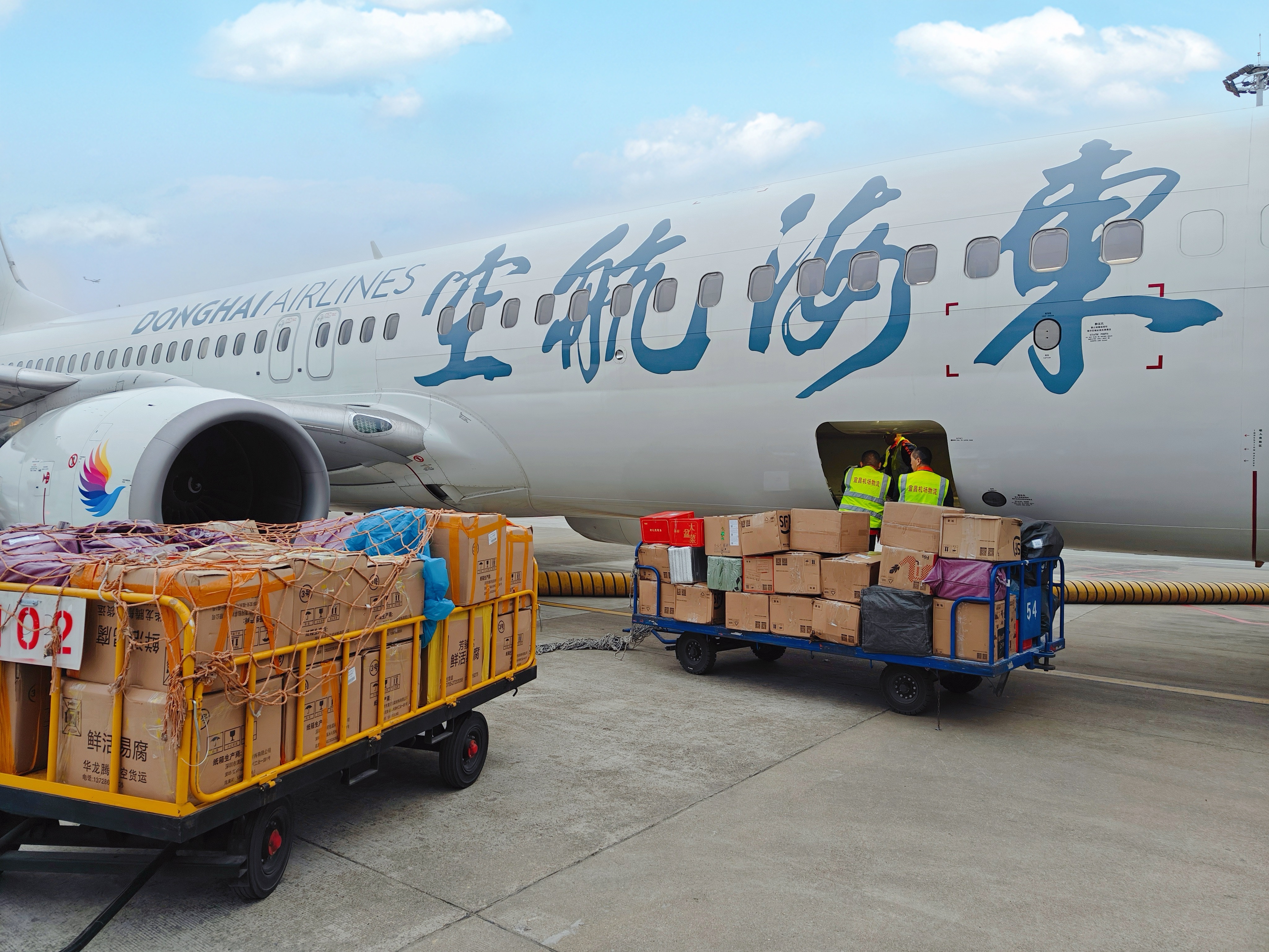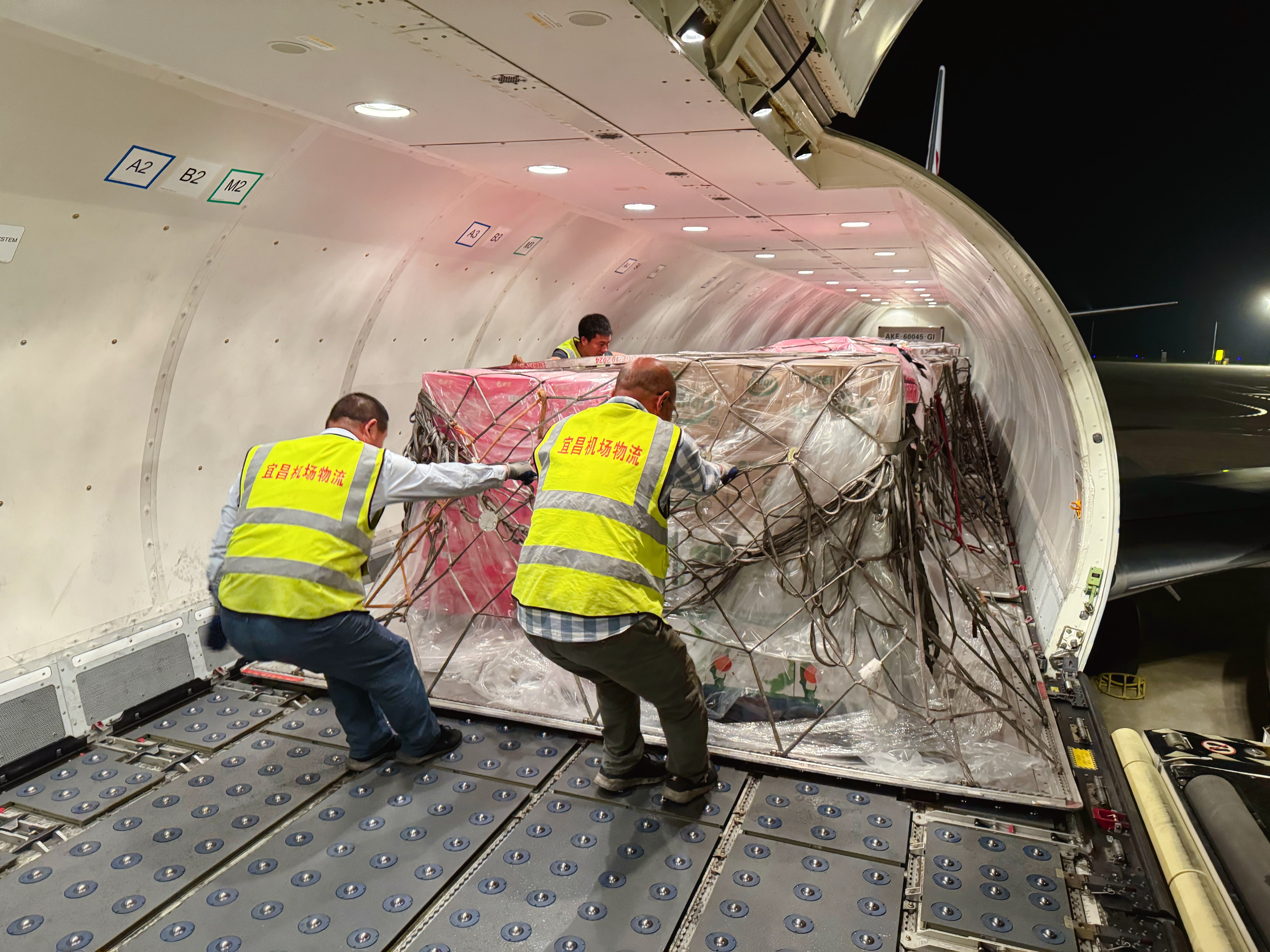 The all-cargo aircraft from Yichang to Zhengzhou is unloading at Yichang Sanxia International Airport.Yichang-made exports transported by air include agricultural and sideline products, food additives, packaging materials, canned foods, and chemical products. The imports primarily consist of daily necessities and food, according to an official from the airport's logistics company.