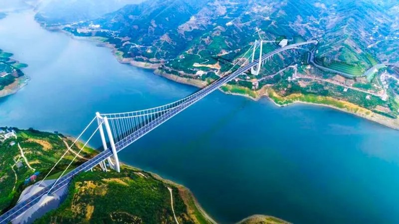 The Shazhenxi Yangtze River Bridge is a dual-tower, single-span box girder suspension bridge with a main span of 968 meters. The north tower stands at 205.4 meters in height, while the south tower reaches 223.4 meters.
