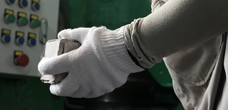 A worker holds a raw material “cube” before placing it into the furnace.