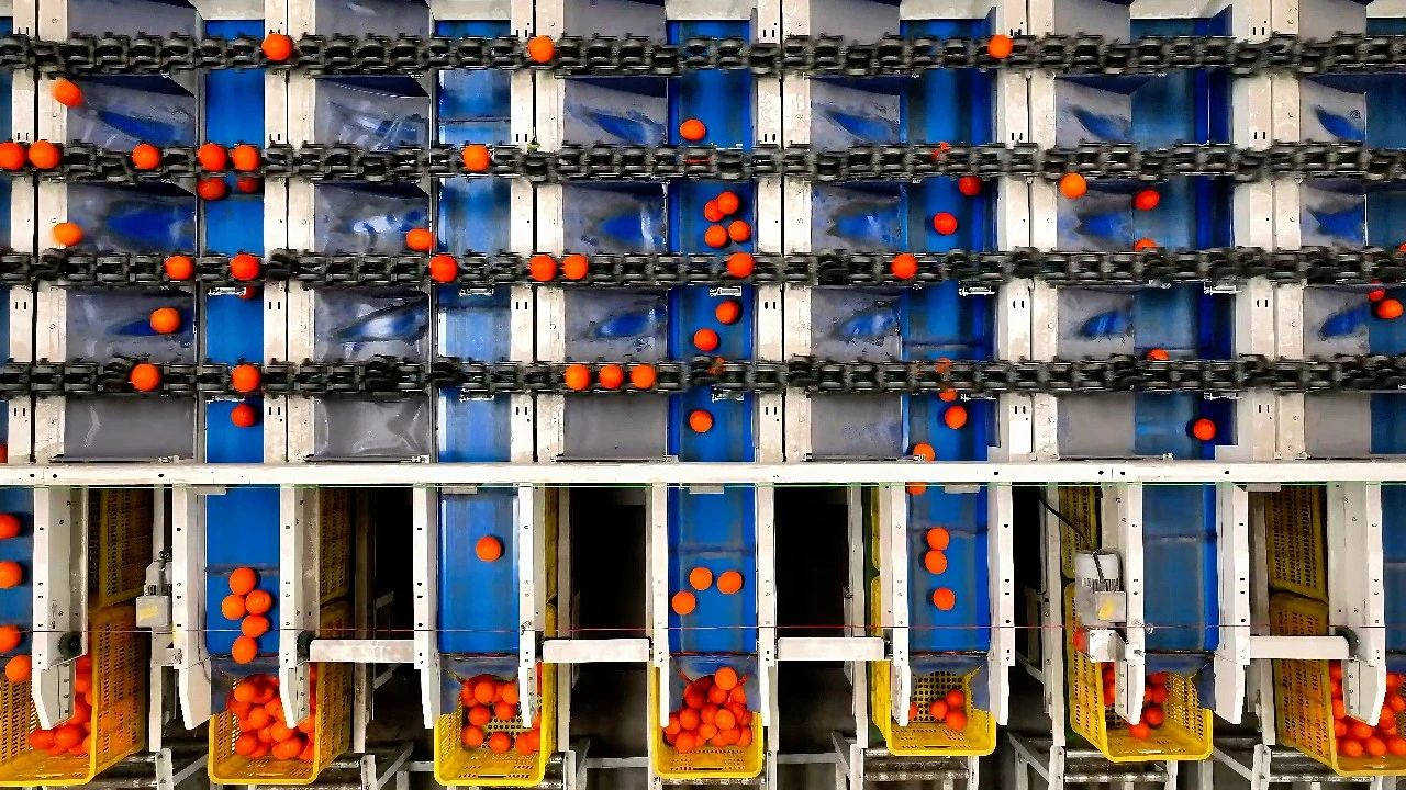 <caption>An automated sorting line is categorizing navel oranges based on quality.