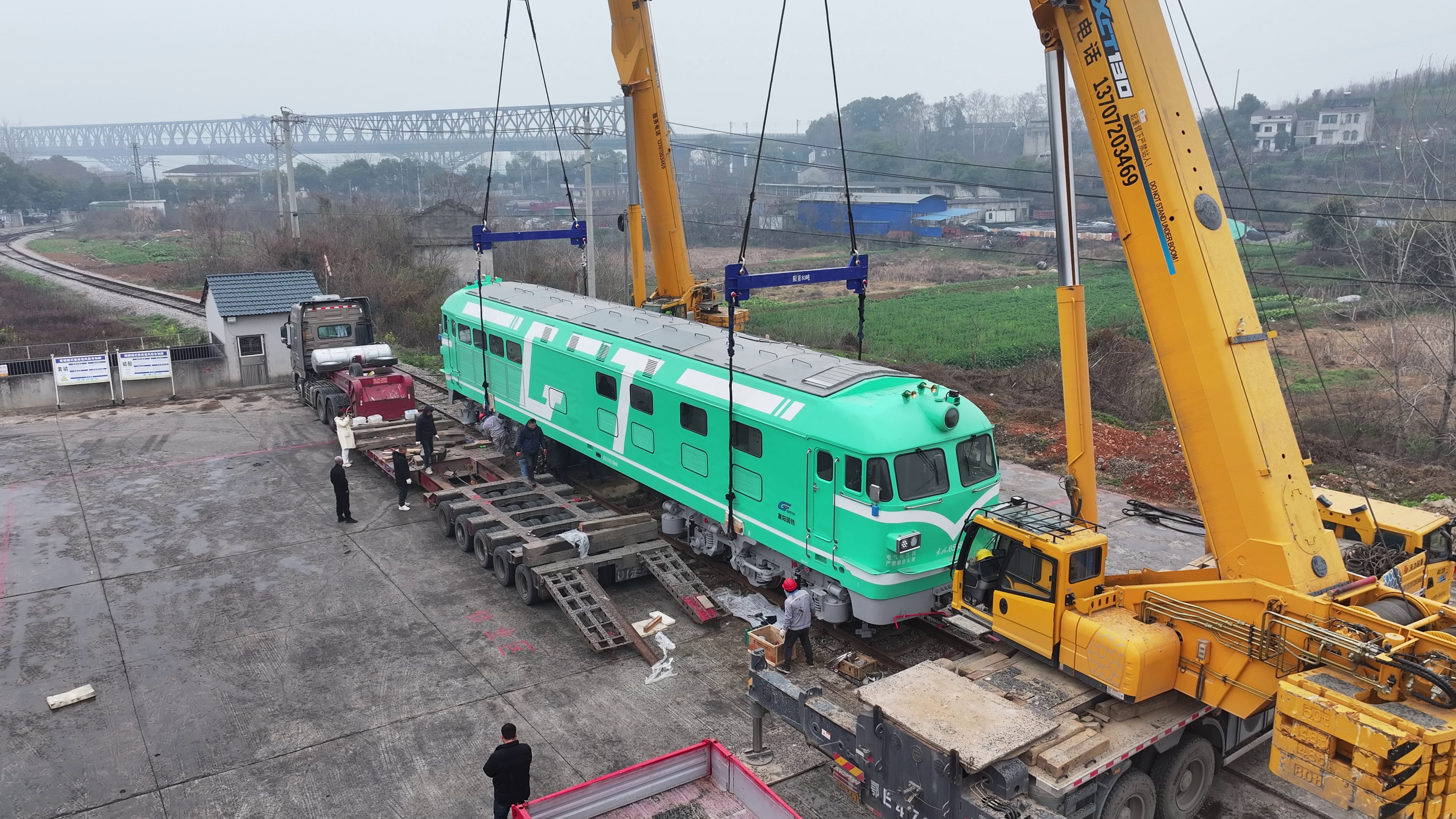 The 21.1-meter, 138-ton pure electric locomotive is being lifted onto the rails for assembly and testing.