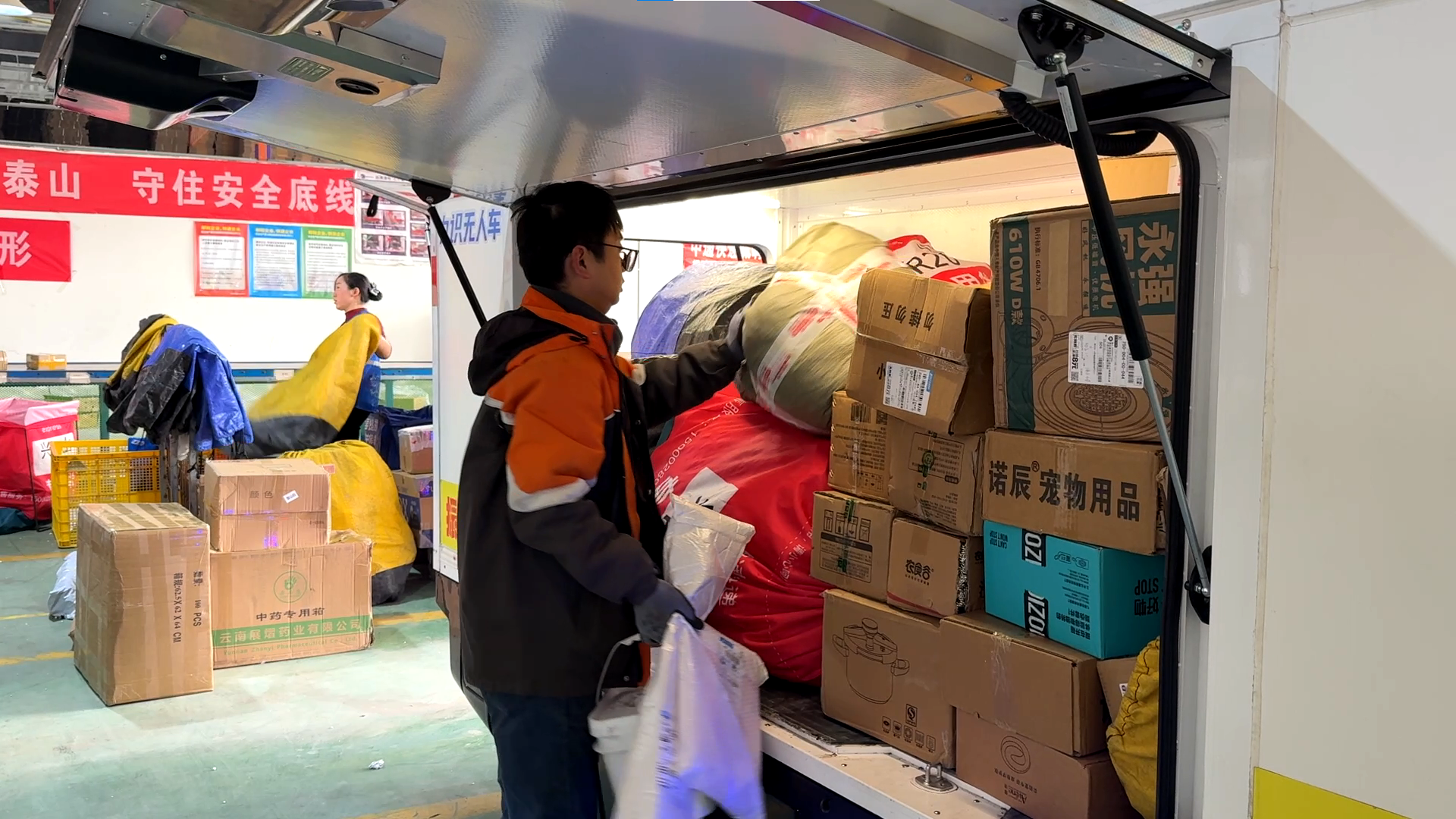 A worker loads parcels into the unmanned delivery vehicle.