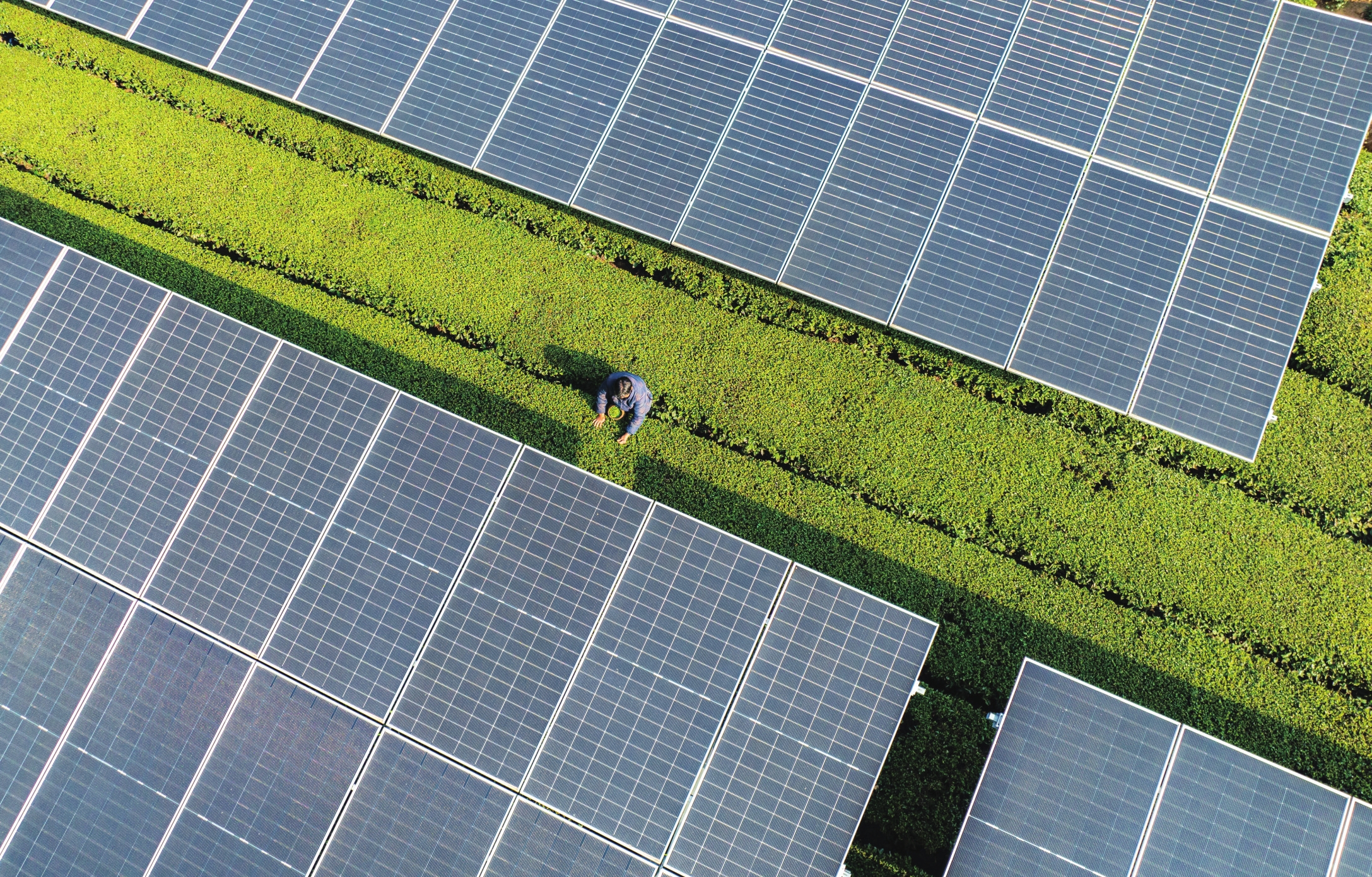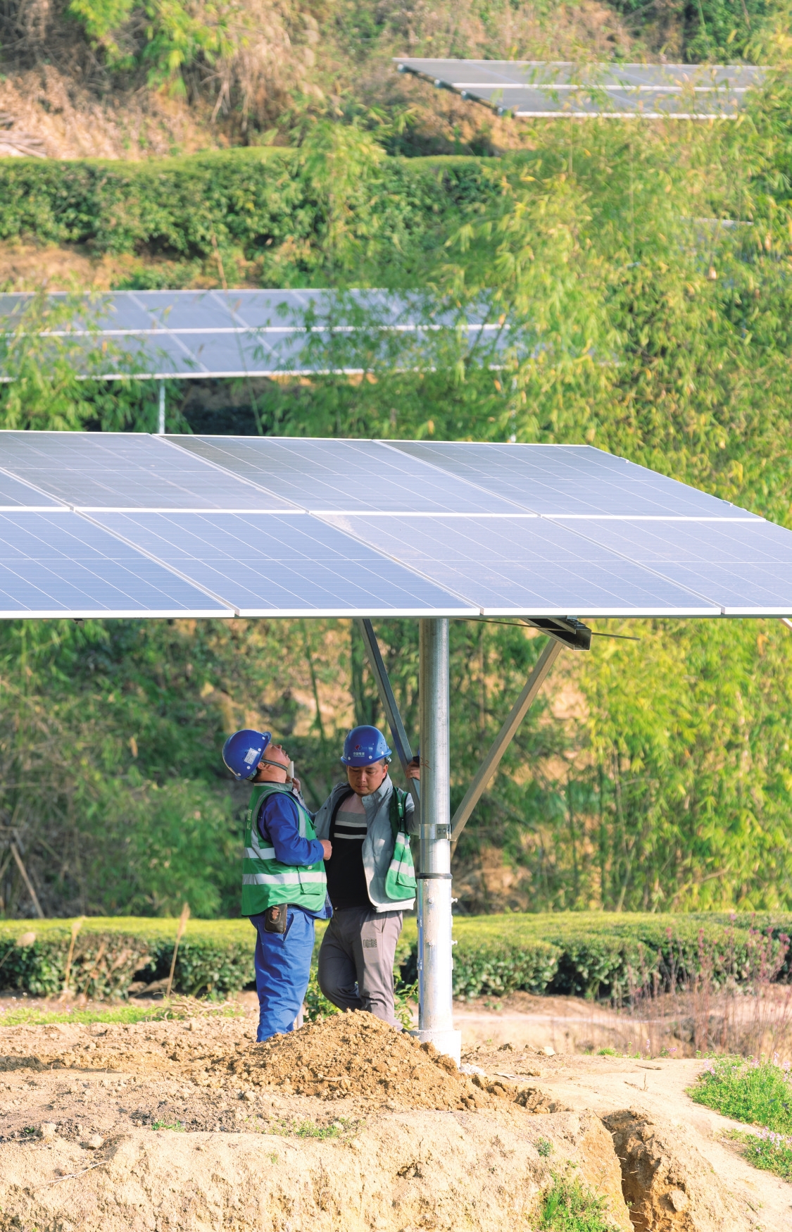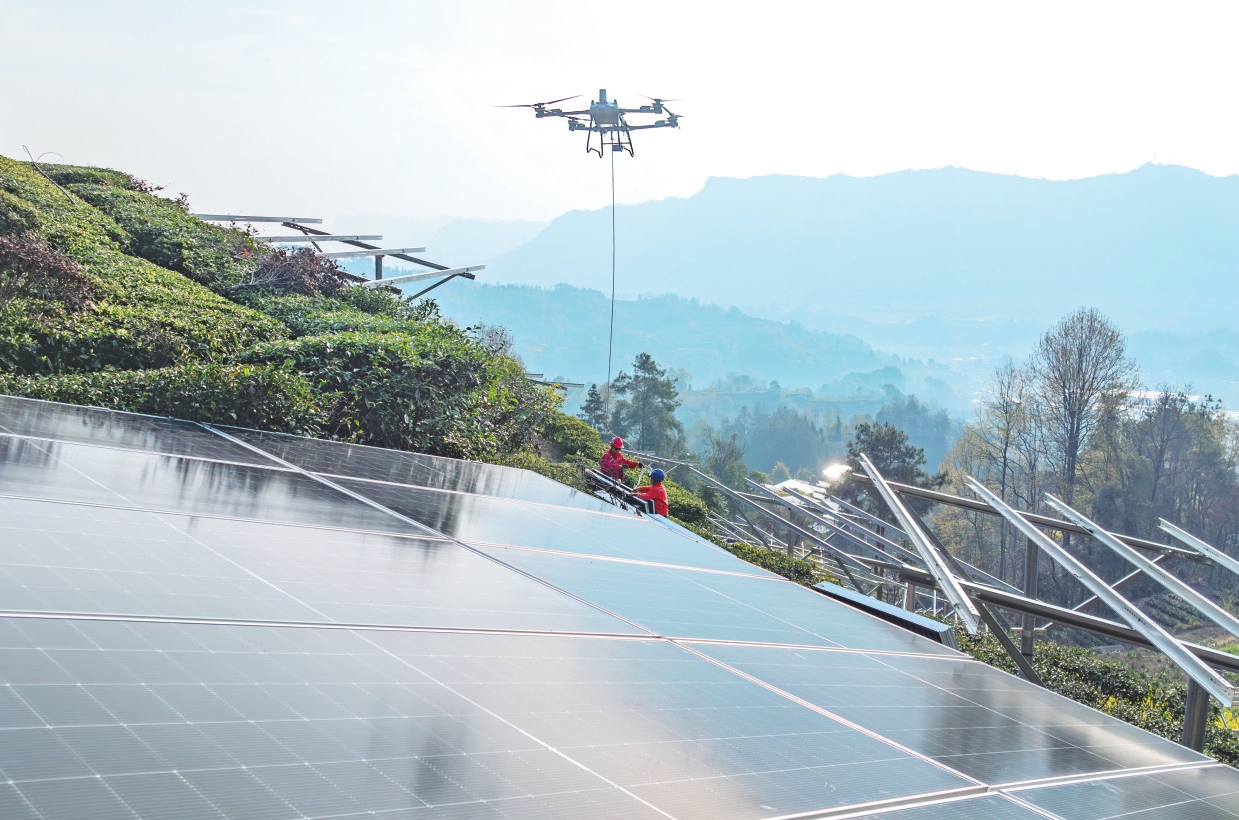 Many solar panels have been installed at tea gardens in Zigui County. The photovoltaic panels not only generate solar power but also provide shade, creating ideal growing conditions for the tea plants below. The project is expected to generate an additional annual income of 900 yuan per mu (US$1,860 per hectare) for tea growers.