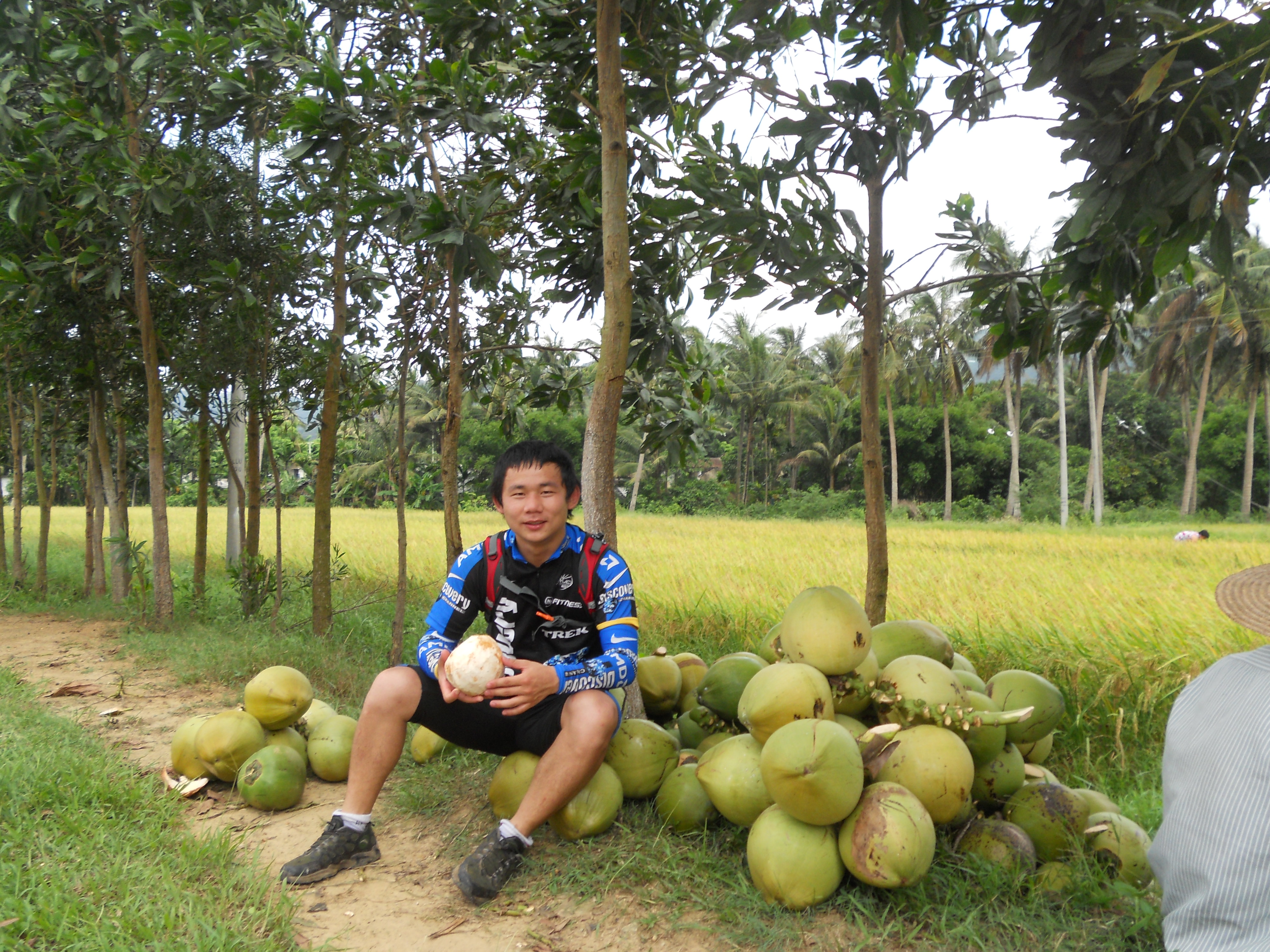 Wan is resting by a pile of harvested coconuts while cycling from Sanya to Lingshui in Hainan.