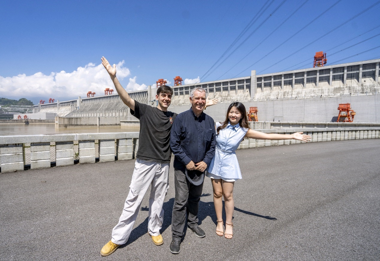 Miguel de Oliveira Manacero, Jerry Grey, and Jin Yeongeun take a group photo in front of the Three Gorges Dam.