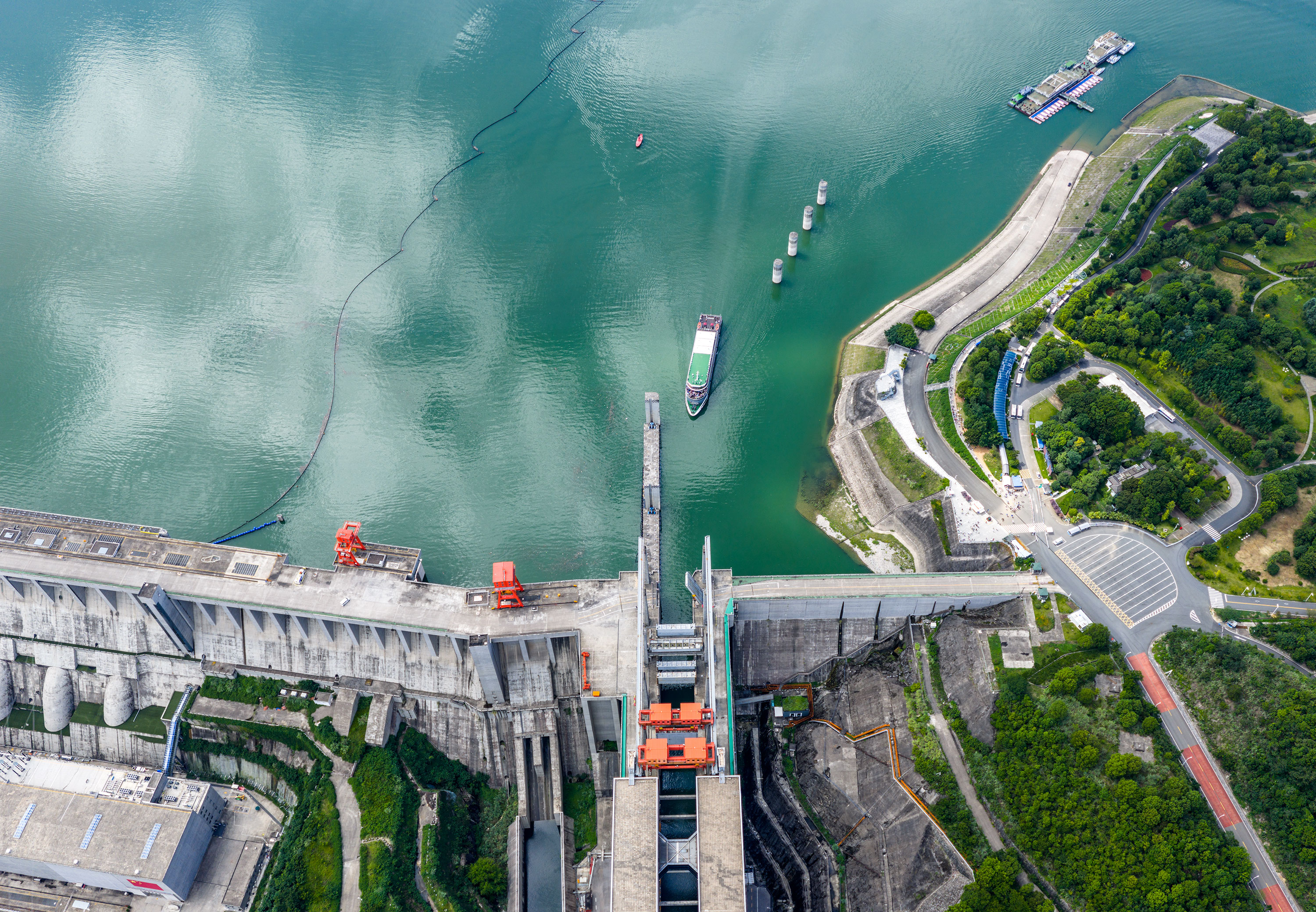 A cruise ship passes by the Three Gorges ship lift. Photo by Wang Gang.The ship lift began trial operations on September 18, 2016, forming a joint navigation pass with the Three Gorges locks. Large ships "climb the stairs" via the locks, while smaller vessels "take the lift.”