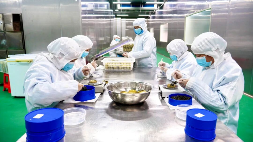Workers process caviar in the new production workshop.The new processing center will enable the Qingjiang Sturgeon Valley Industrial Park to produce more efficiently, helping Yidu’s caviar become more competitive in global markets.