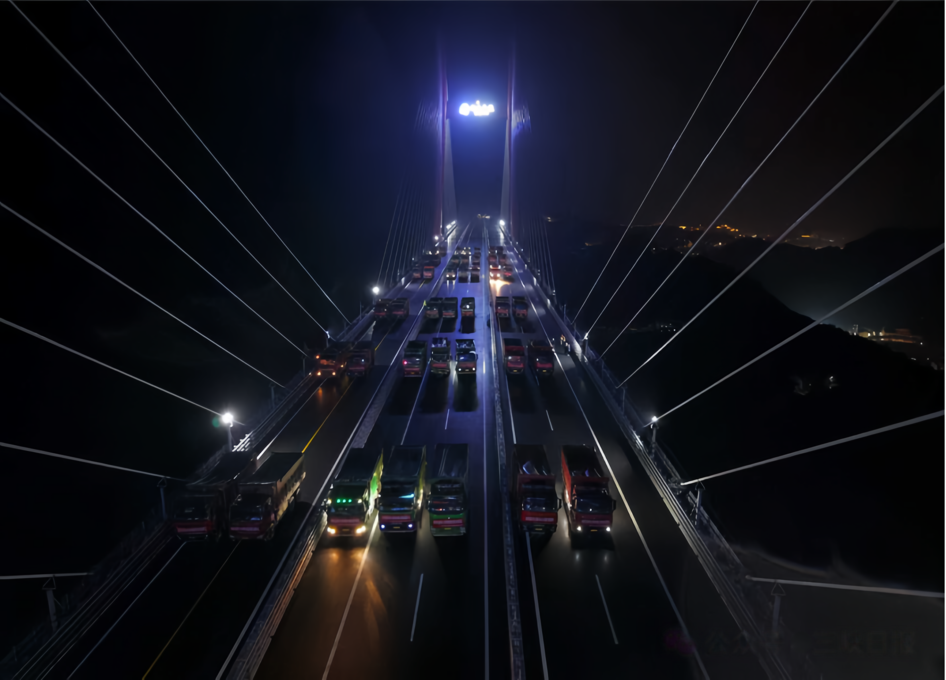 Load testing in progress on the Chaibuxi Bridge.Load testing serves as the final inspection before a bridge opens to the public, simulating real traffic conditions to verify structural safety and load-bearing capacity. The tests on Chaibuxi Bridge covered three major systems: as-built state assessment, static load tests, and dynamic load tests. During the static load phase, 19 progressively intensive test scenarios were carried out using a fleet of 35-ton tri-axle trucks. Up to 49 trucks were deployed simultaneously, generating an extreme load of 1,715 tons, equivalent to the total weight of about 300 adult elephants.