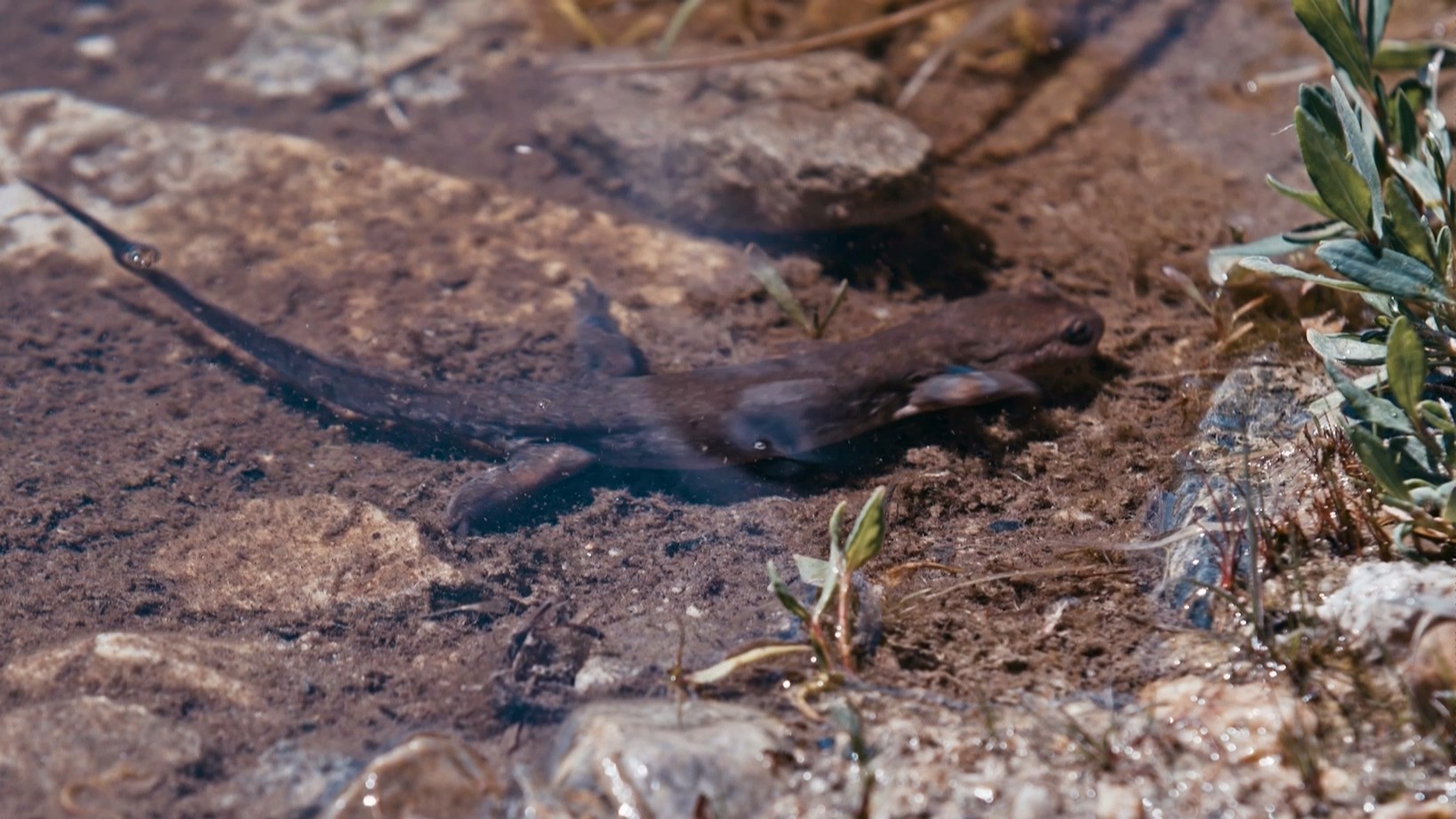 A Wushan salamander quietly living in the clear mountain stream of the Chongqing Wulipo National Nature Reserve.