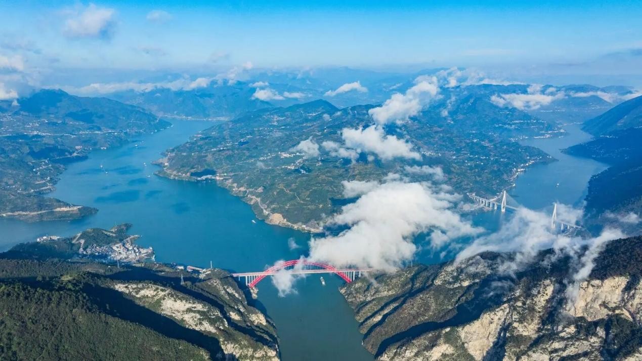 Clouds and mist hover over the entrance to the Xiling Gorge along the Yangtze River. Photo by Peng Qiang.