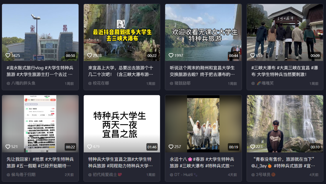Many netizens share their itineraries on Douyin.According to a staff member of the Three Gorges Waterfall Scenic Area, last Saturday more than 2,500 college students reached the scenic area by public transport. Most were students from Yangtze University and Jingchu University of Technology from Yichang's neighboring cities, as well as students from China Three Gorges University.