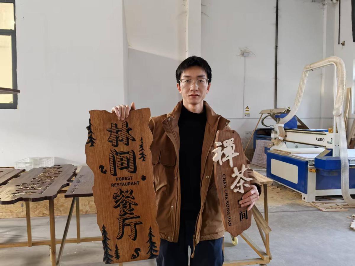 Ren Yang displays his completed wooden plaques. [Photo provided to chinadaily.com.cn]Surrounded by stacks of timber waiting to be repurposed, Ren transforms raw pine, paulownia and beech into bespoke wooden plaques for restaurants, boutique homestays and campgrounds.
