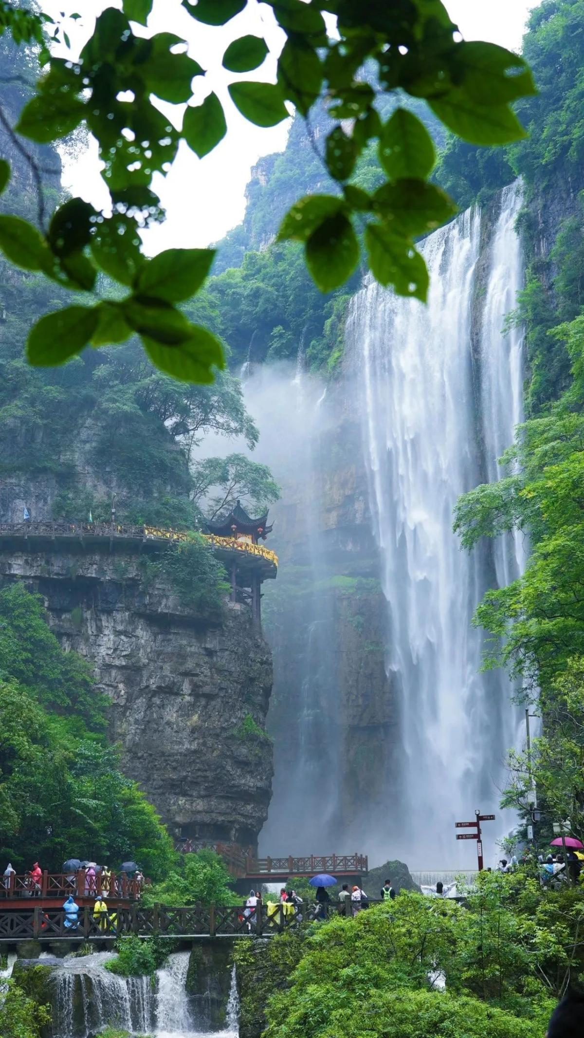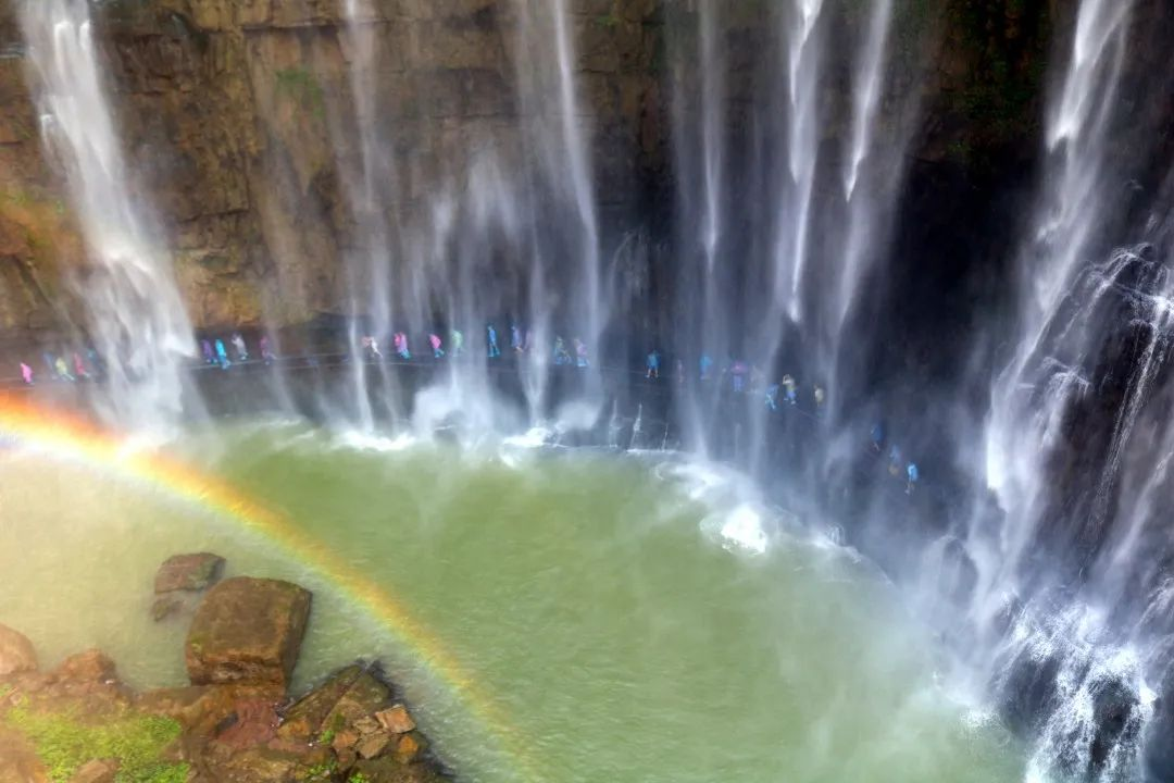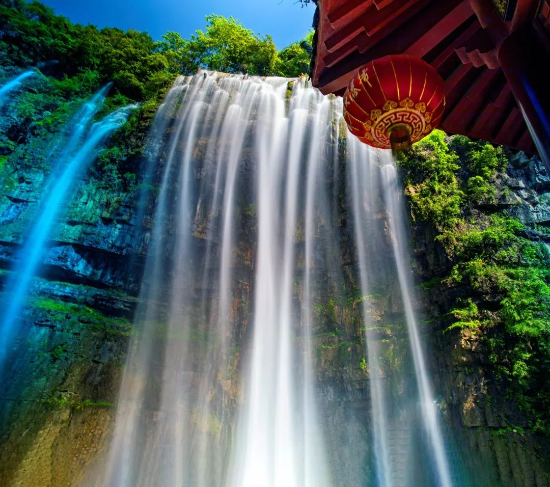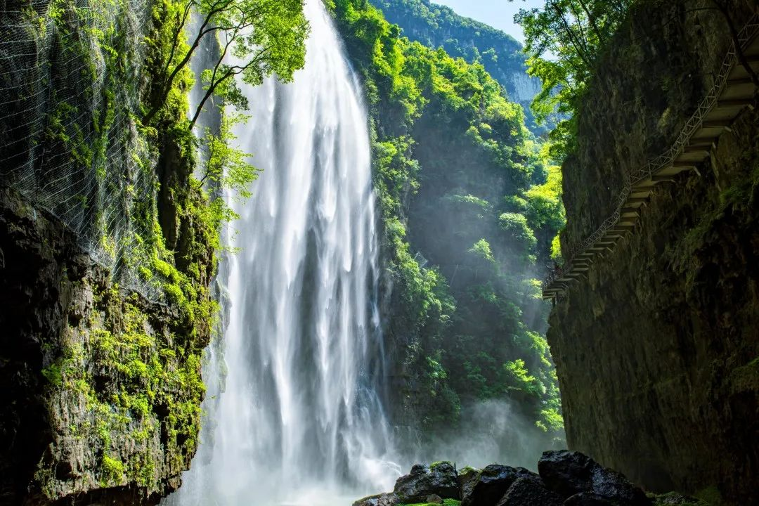 The main waterfall of the Three Gorges Waterfall is 102 meters high and 80 meters wide. Tourists have the opportunity for the unique experience of walking behind the waterfall. The scenic area also has complete and abundant fossils from the Cambrian and Ordovician periods.