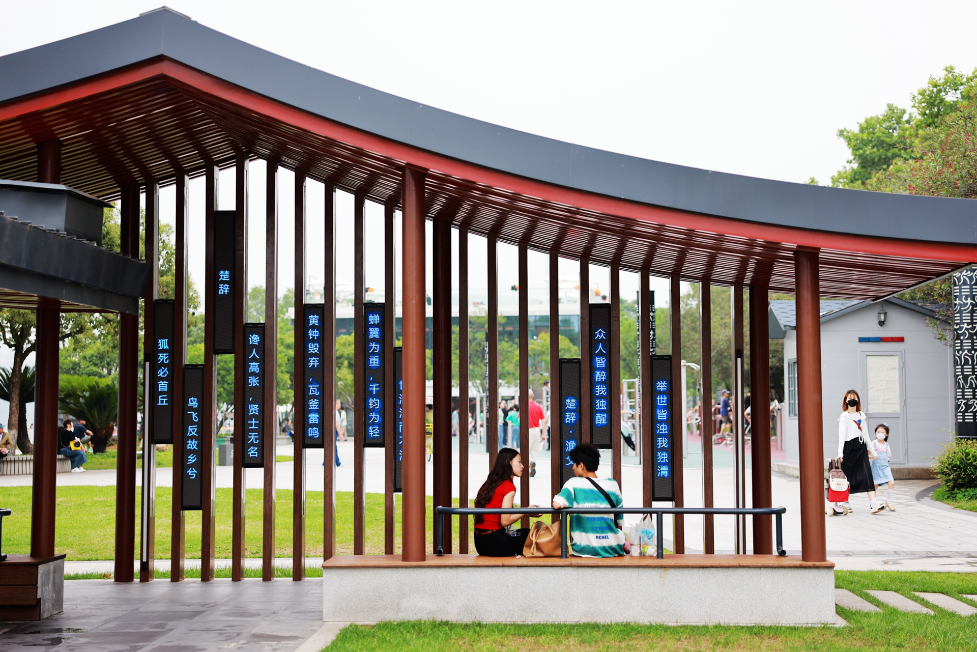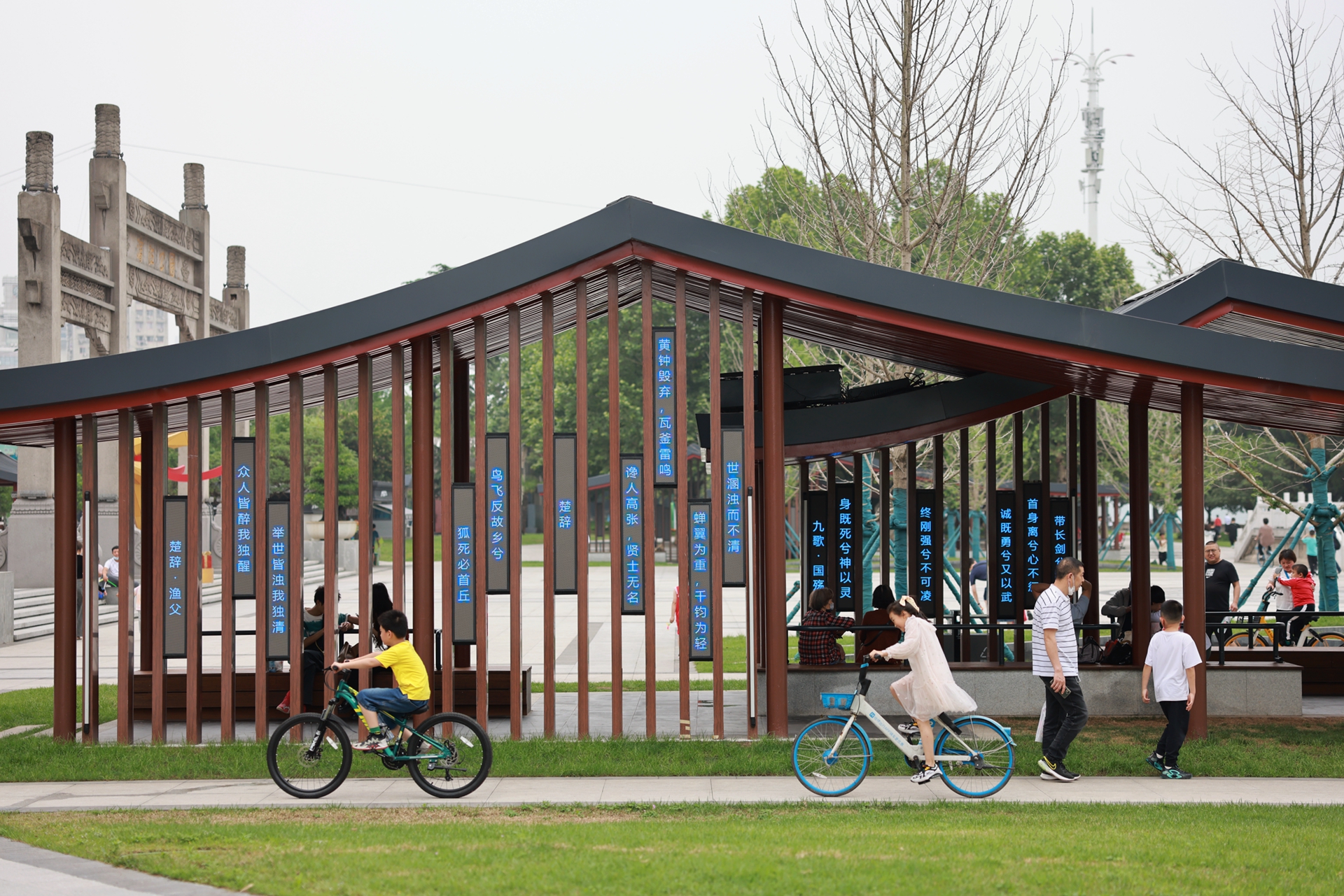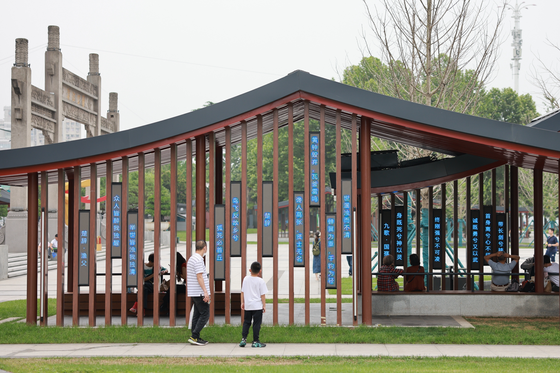 In Yichang's Binjiang Park, two renovated corridors have been given a new look. Quotations from Qu Yuan's “Chuci,” a famous collection of poetry from the southern state of Chu during the Zhou dynasty (1046–256 BCE), are displayed between the columns. Walking in the corridor of poems, one can raise their head to recite and appreciate the classic poems, while feeling Qu's spirit.