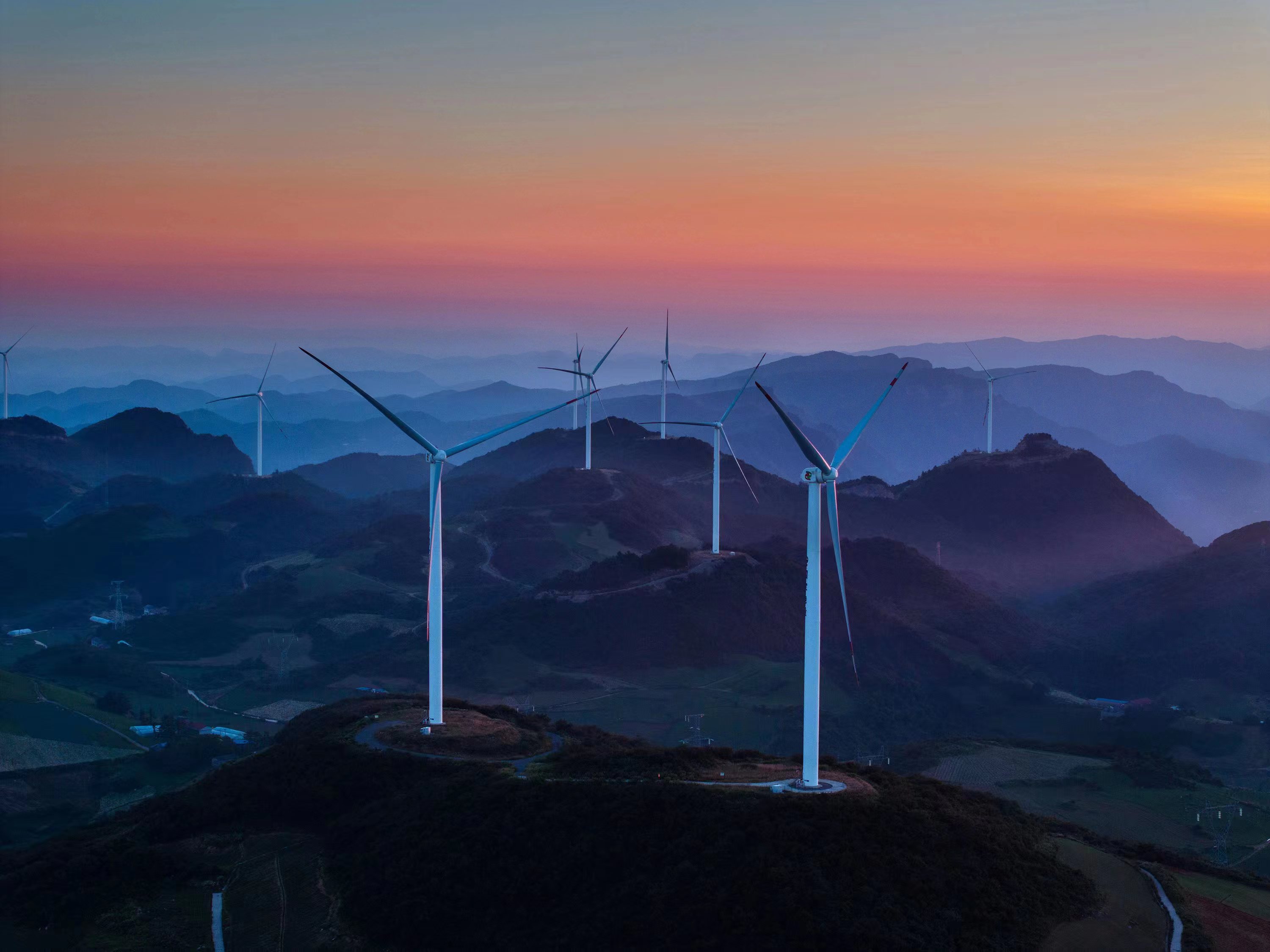 As the sun softly sinks into the horizon, a splendid evening radiance blankets the sky in hues of crimson. The majestic wind turbines of the Yuntaihuang Wind Power Plant resemble a troupe of elegant dancers, gracefully moving with the breeze against the backdrop of the descending sun.