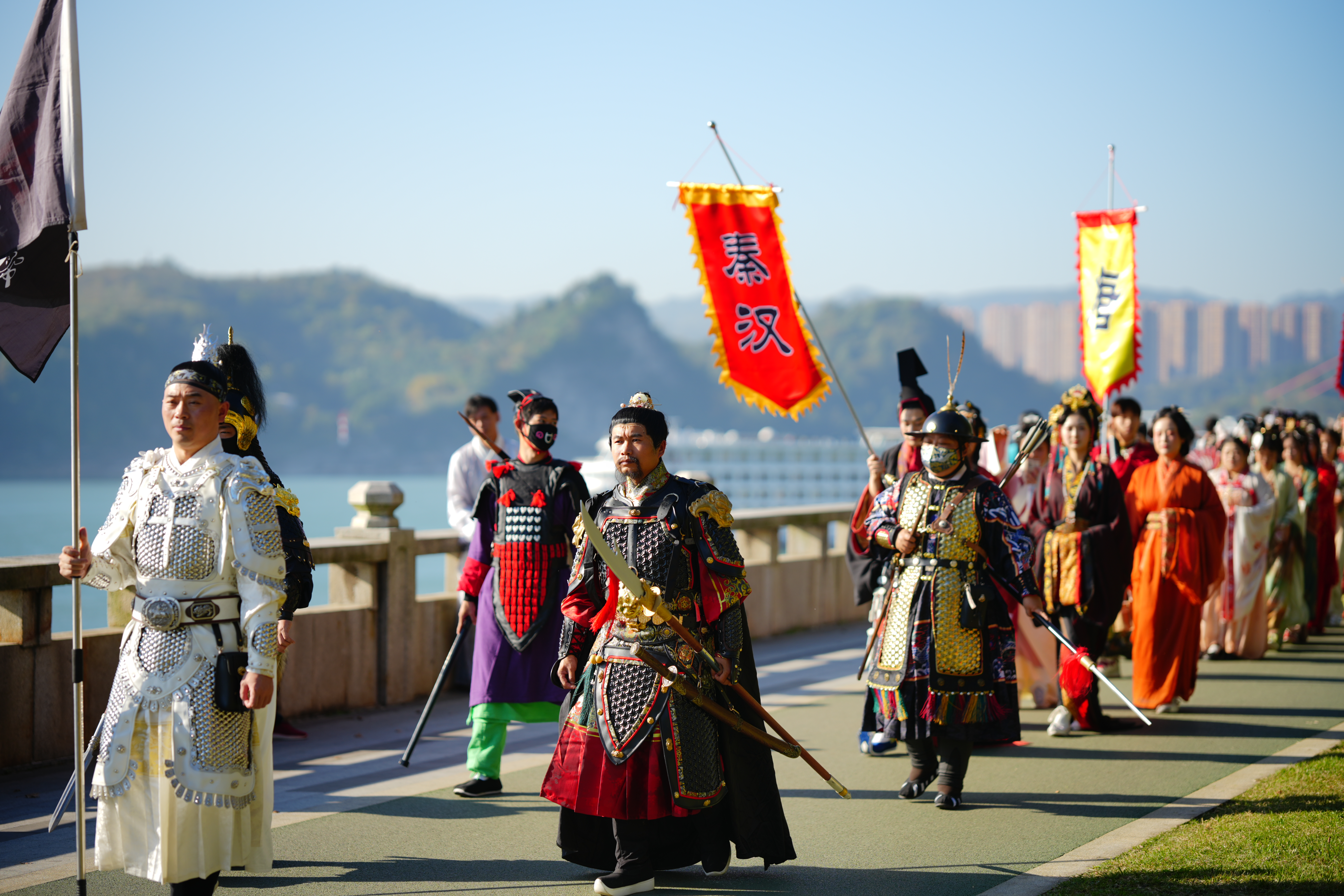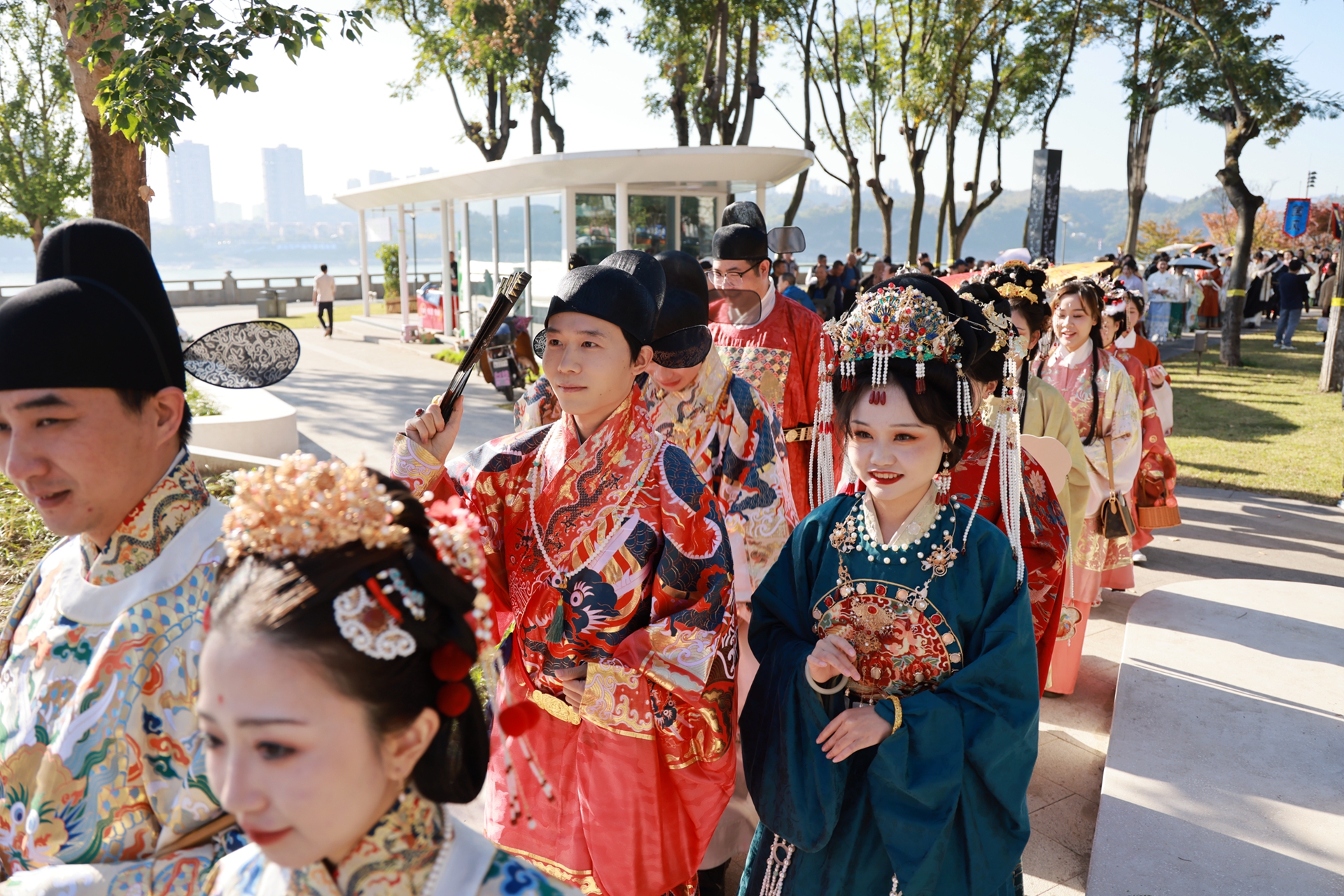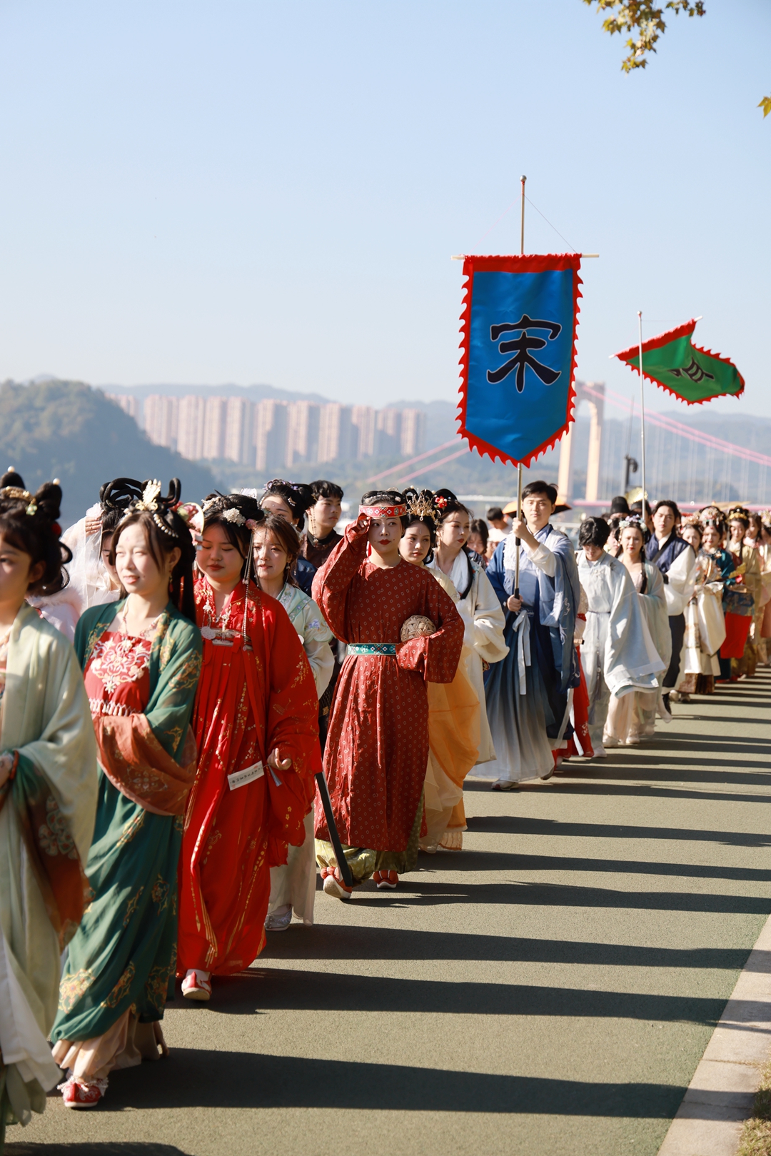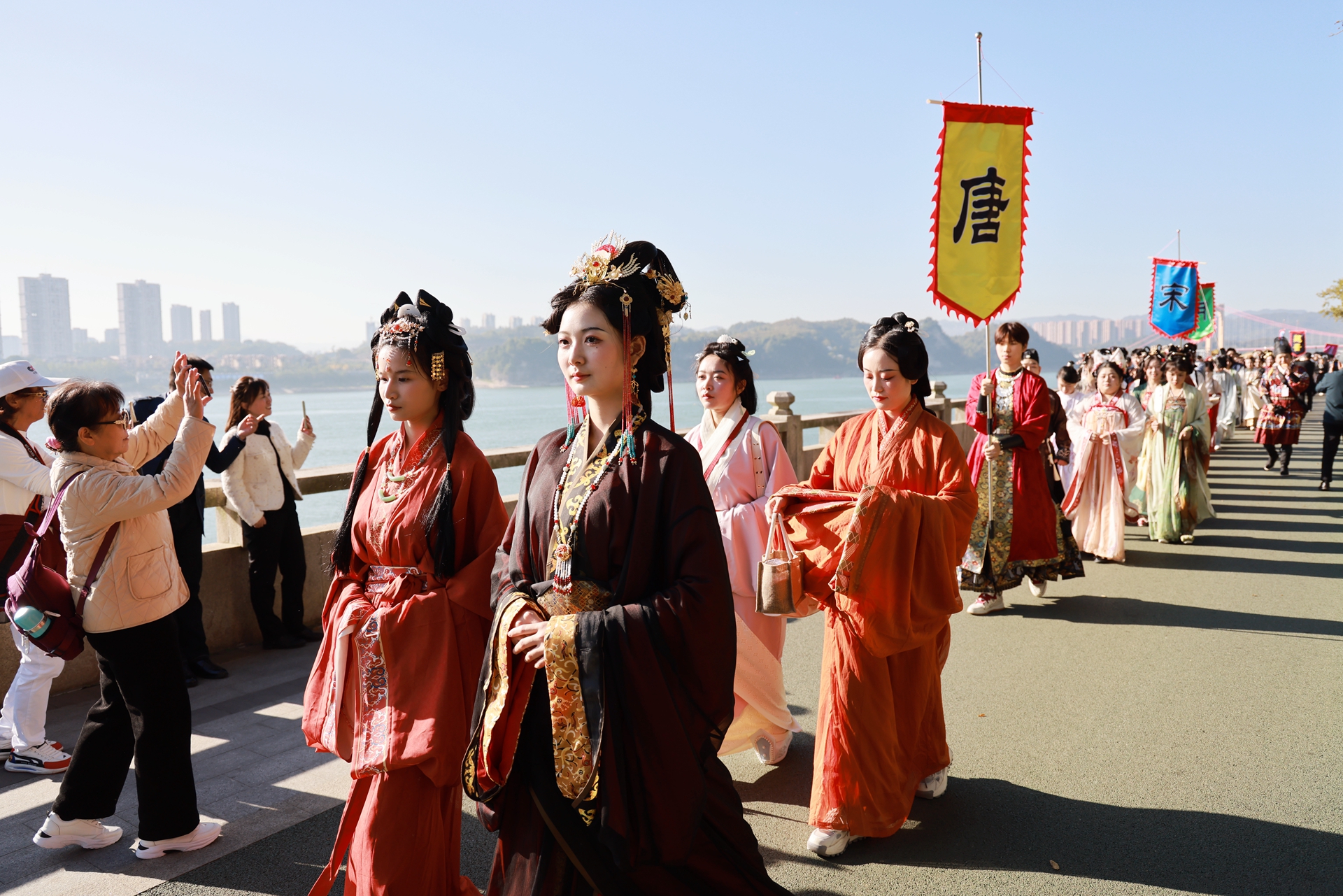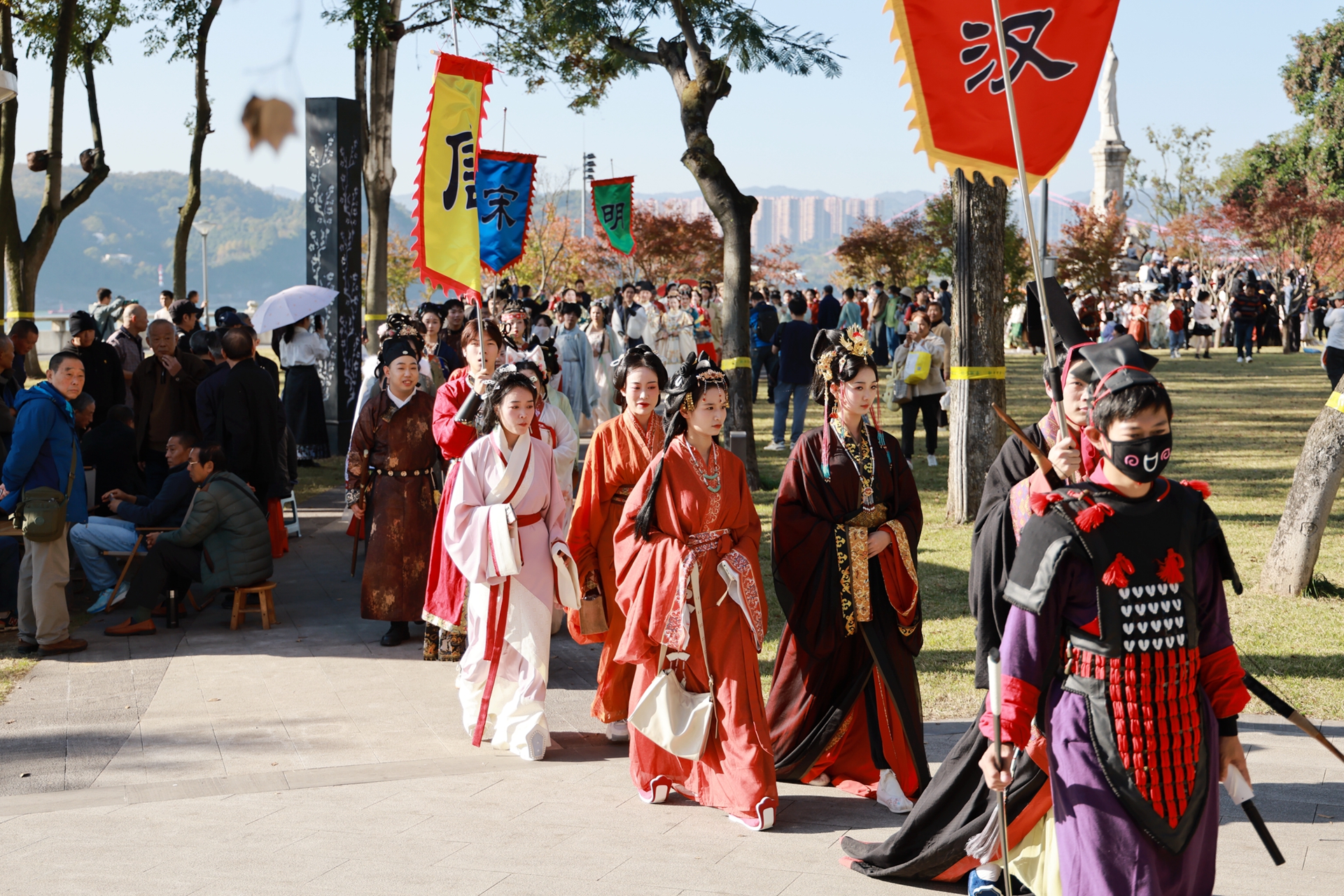 More than 200 Hanfu enthusiasts paraded through Yichang's Binjiang Park yesterday. They dressed up in the traditional costumes of different Chinese dynasties, putting on a colorful spectacle.