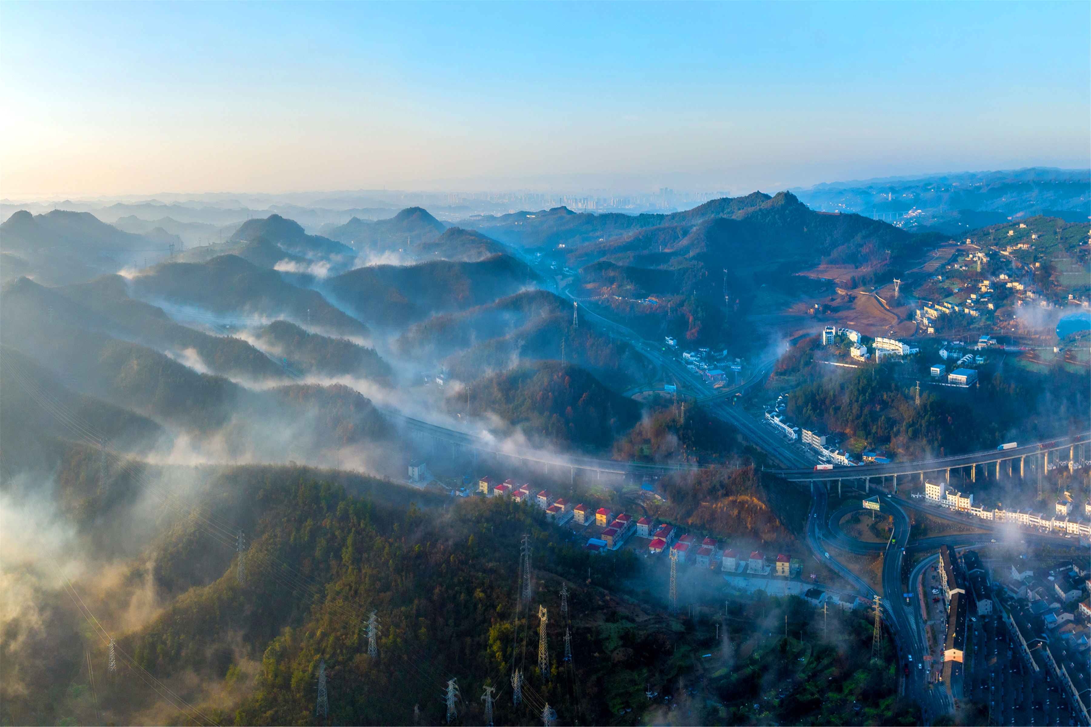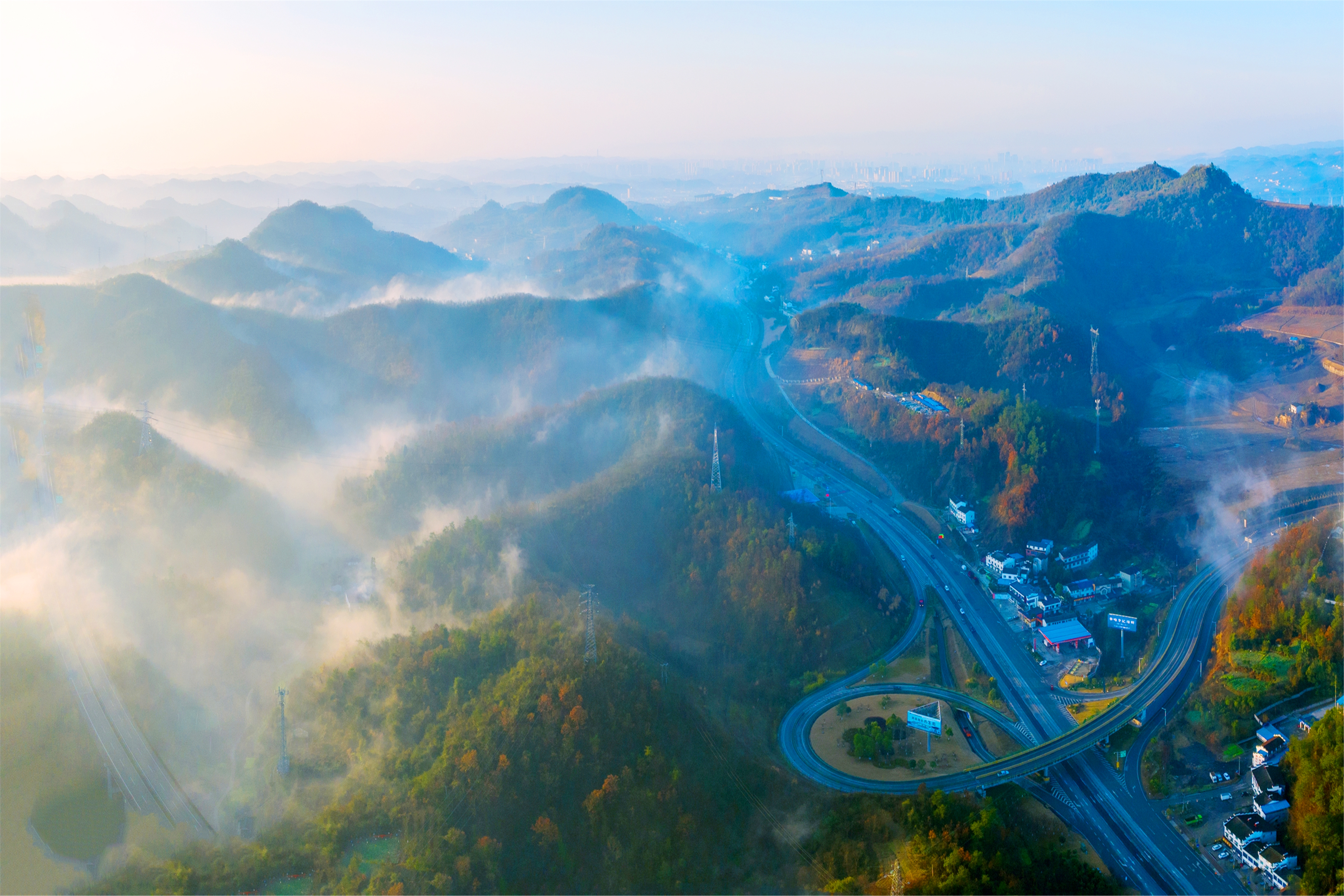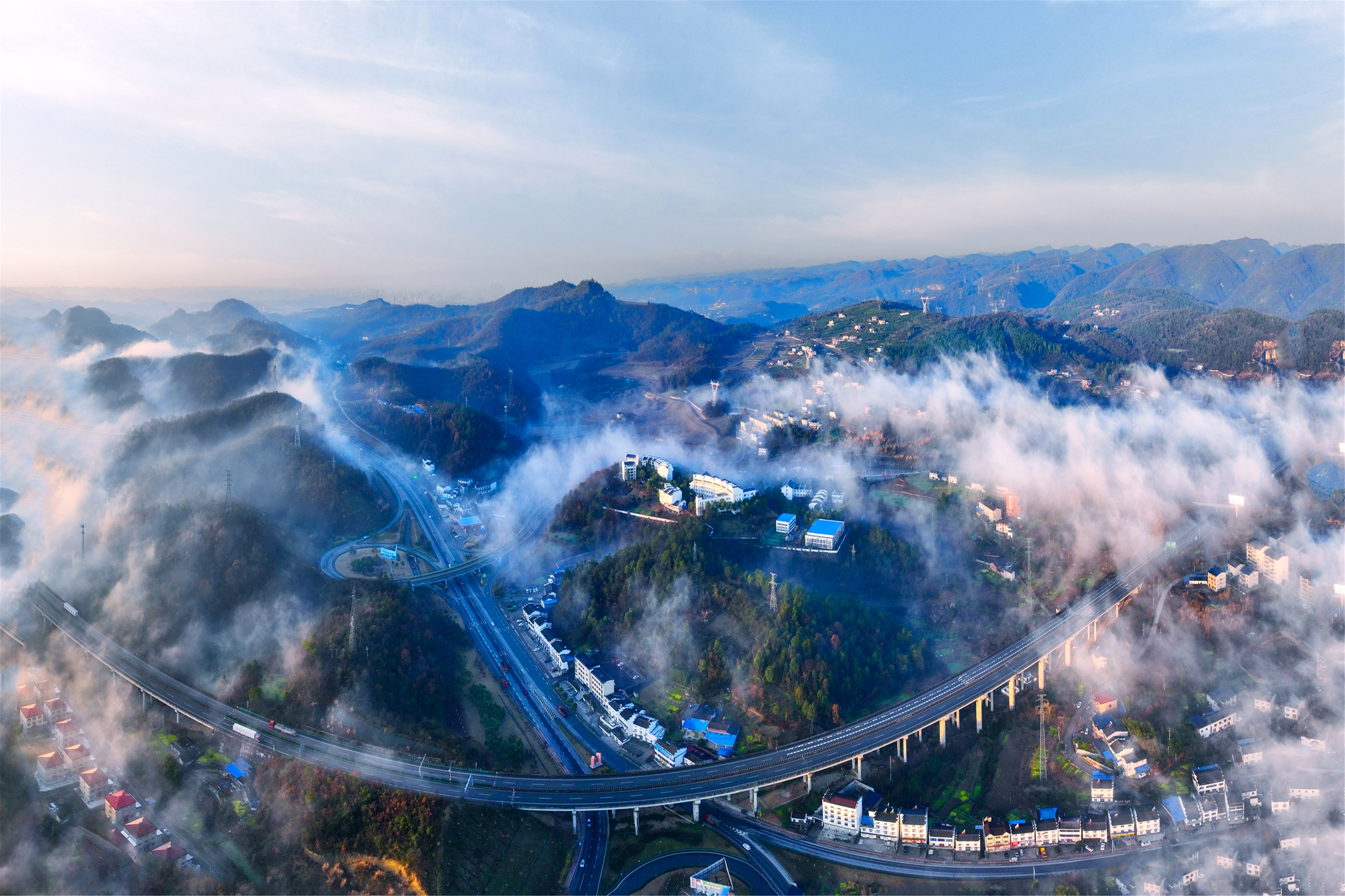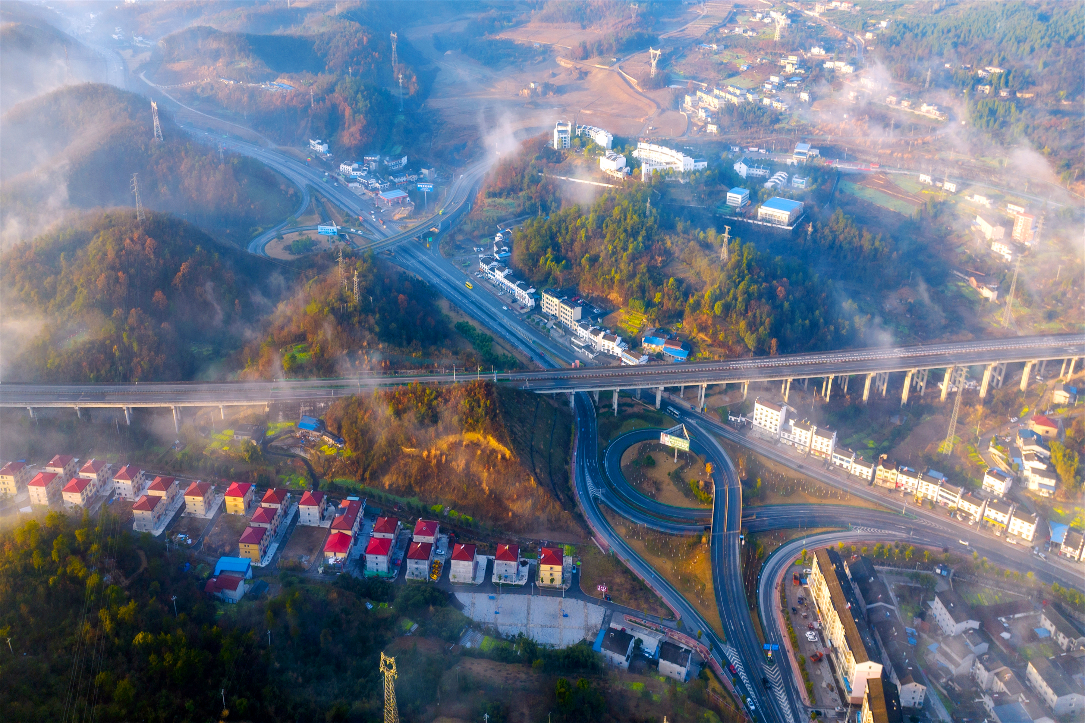 This aerial photo shows a picturesque view of the Yichang North Interchange along the Yichang-Badong Expressway in Yiling, with mist shrouding the mountains and houses hidden among clouds.