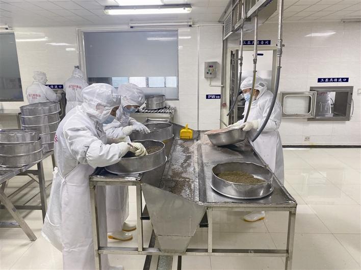 Workers are busy making caviar at the aseptic low-temperature workshop in Yidu’s Sturgeon Valley.