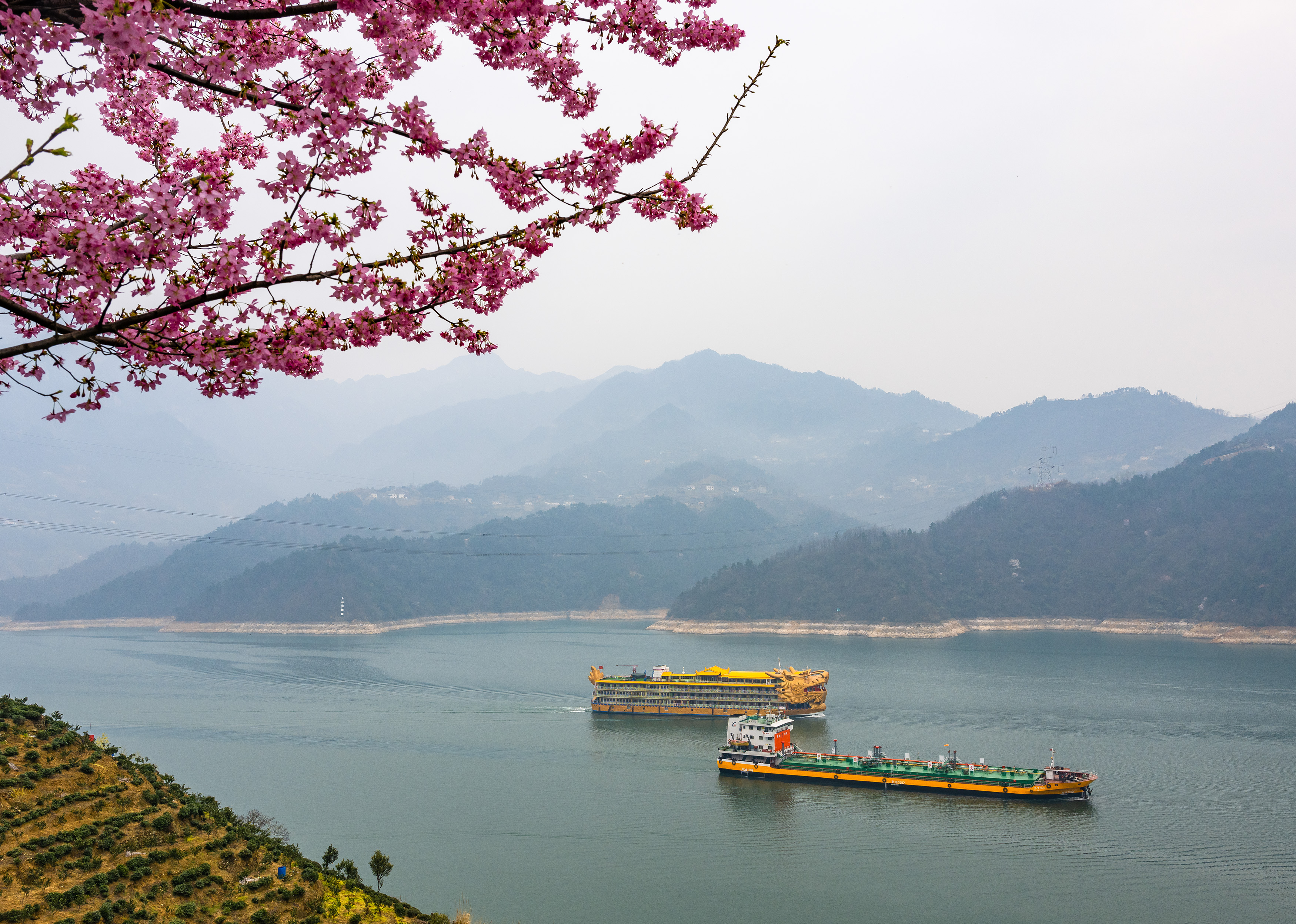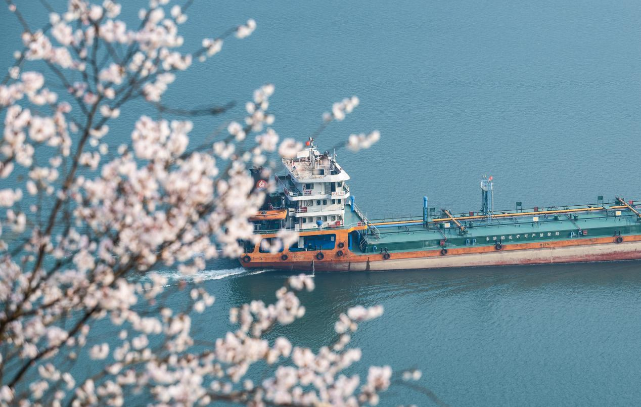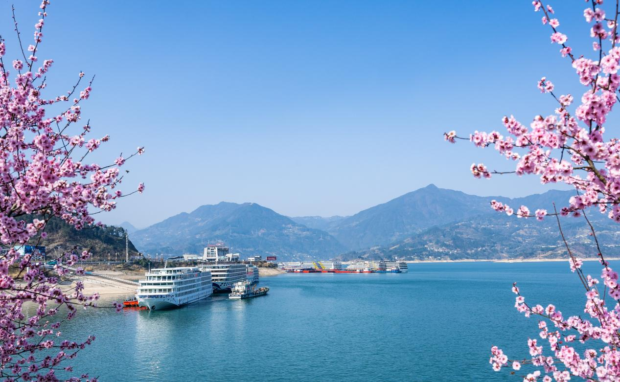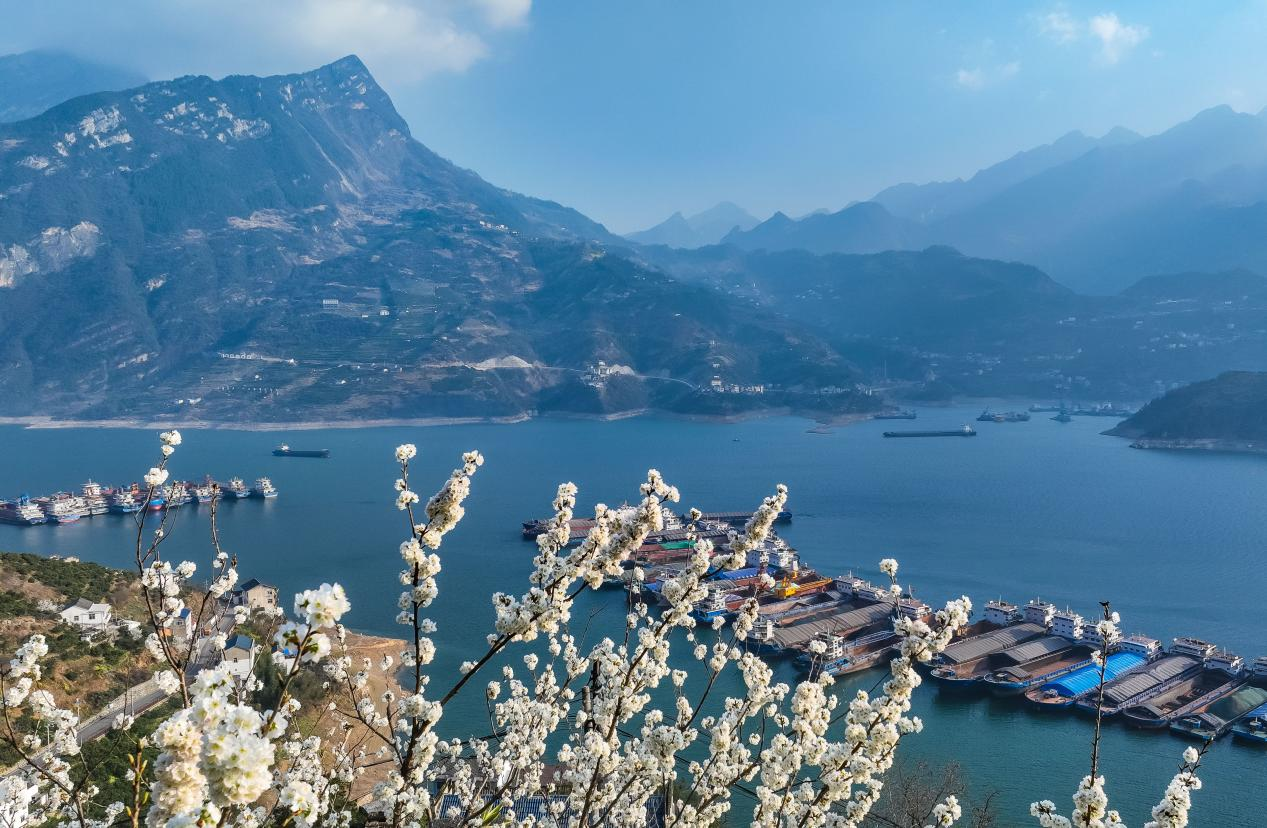In the Three Gorges, spring is in full swing with flowers blooming and ships sailing the waters of the Yangtze River. The distant mountains overlapping and clear skies make for a beautiful spring day.