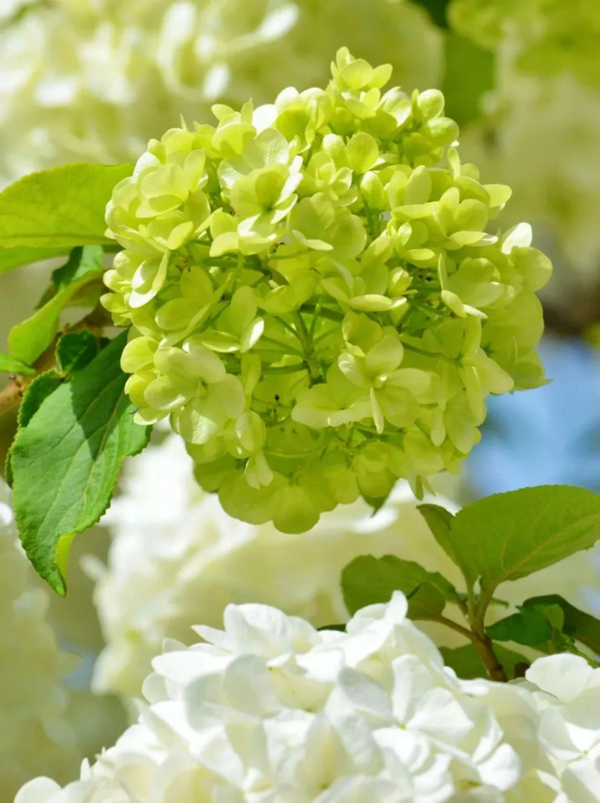 A visitor wearing a forest fashion outfit poses for photos in front of the hydrangea blossoms.