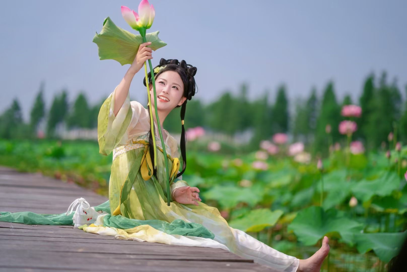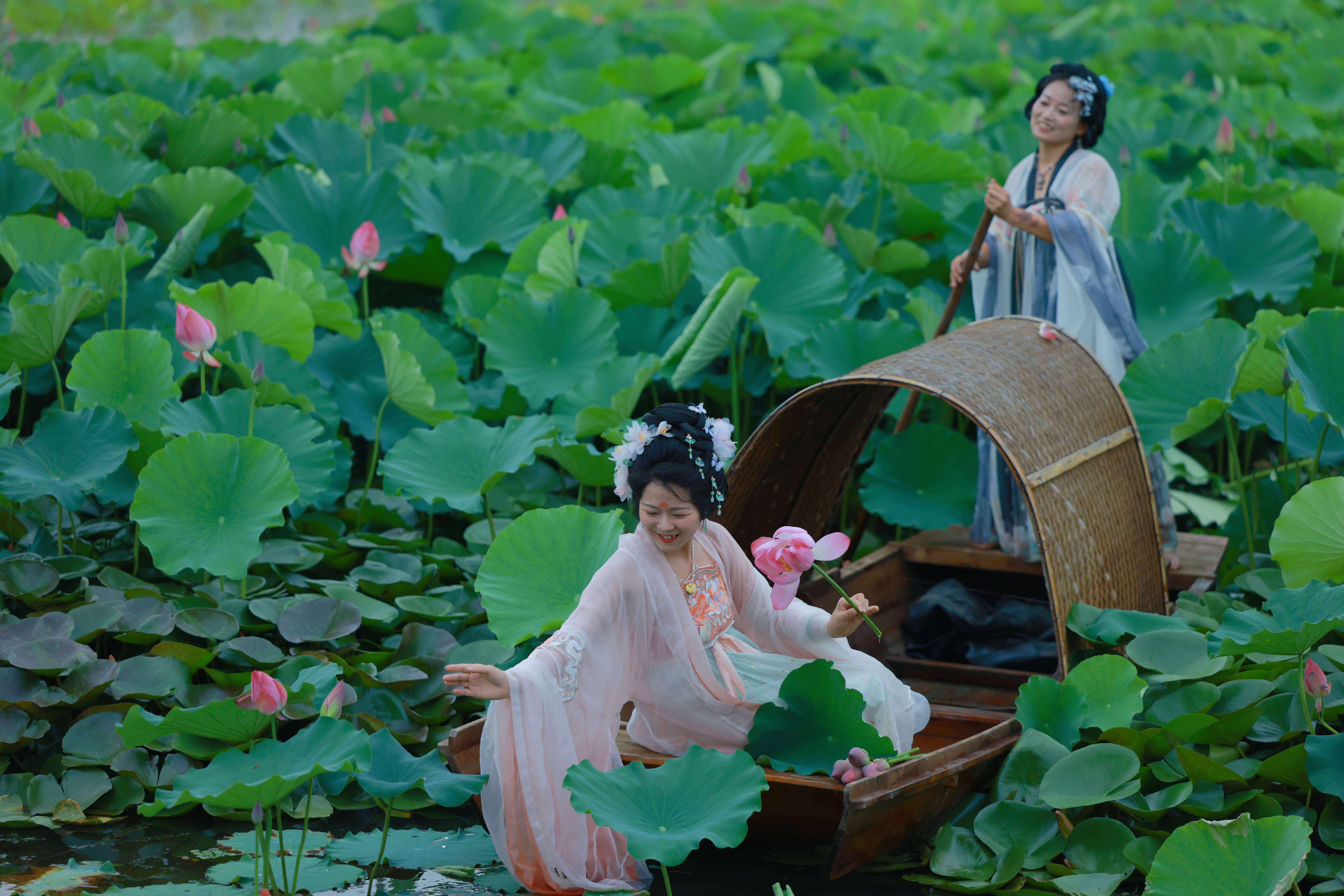 Lotus flowers are currently in full bloom at Jinhu Lake in Zhijiang. The lake is adorned with beautiful white and pink blossoms, which gracefully emerge from the vibrant green leaves. This stunning sight attracts numerous tourists, many of whom are donning traditional Han clothing. They gather by the lake to admire the flowers and capture breathtaking photos. For a more immersive experience, visitors can also take boat rides, allowing them to fully embrace the alluring fragrance and captivating beauty of the blooming lotus.