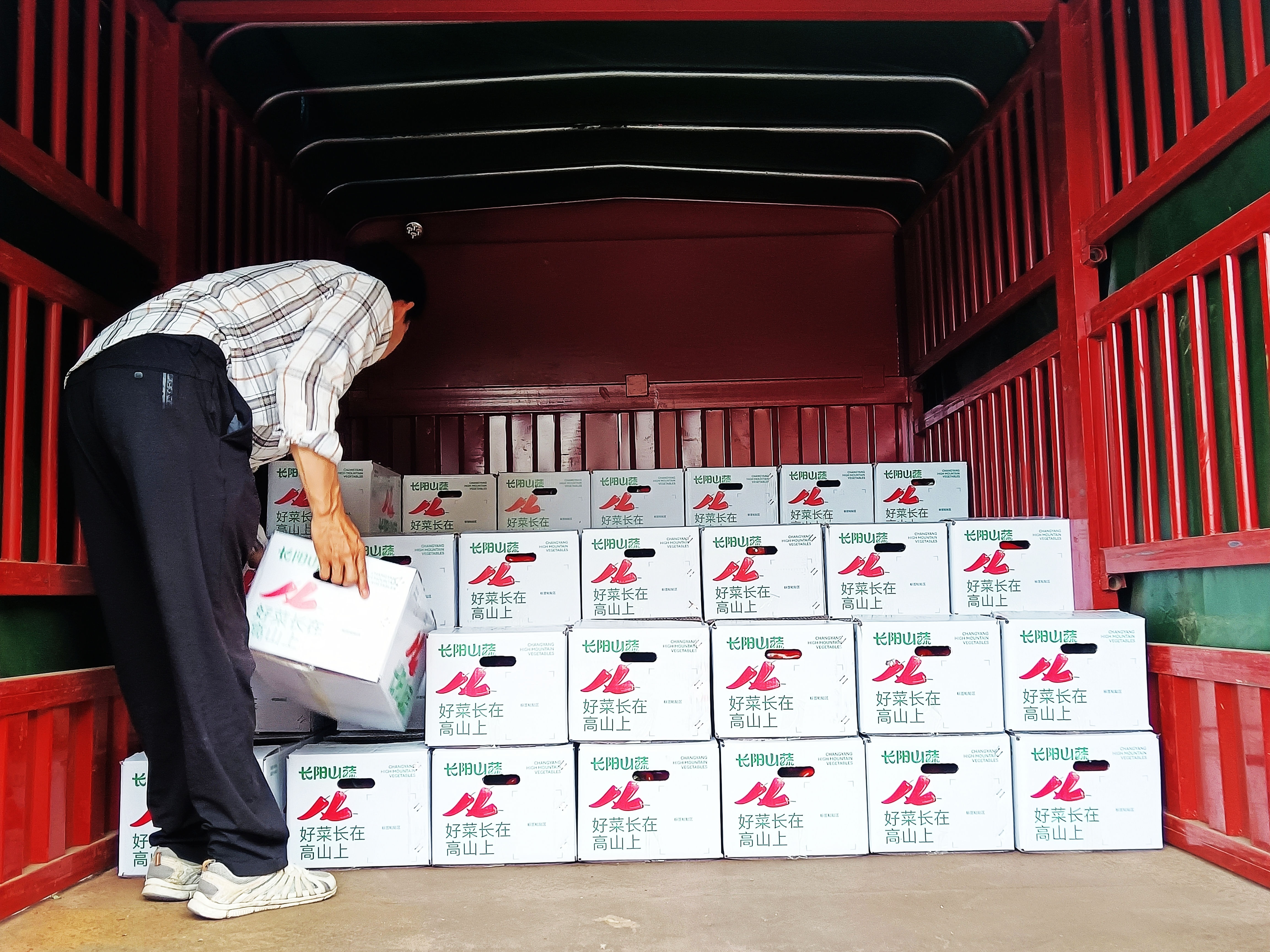 A villager loads alpine vegetables onto trucks. Photo by Lei Jingxia.