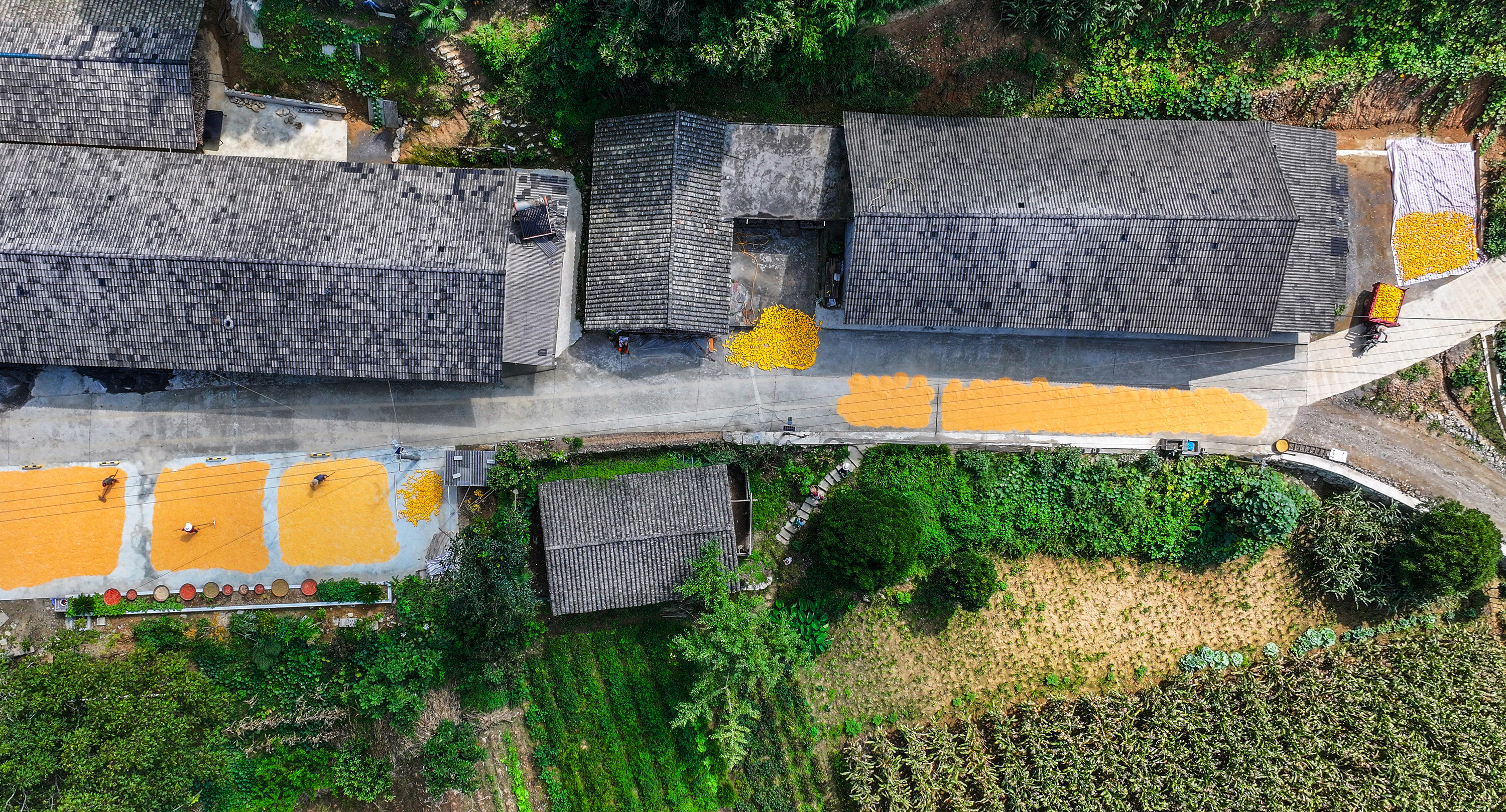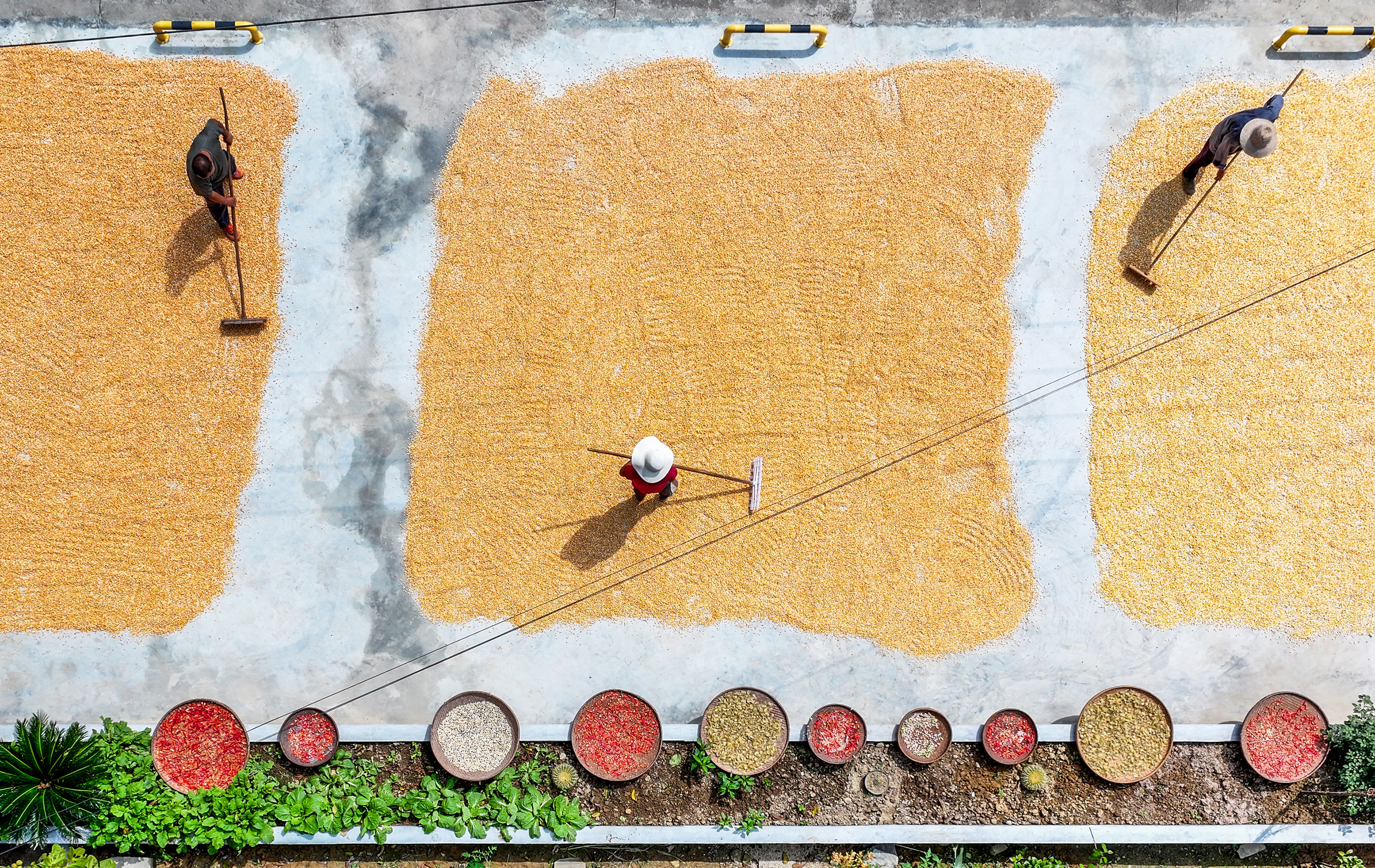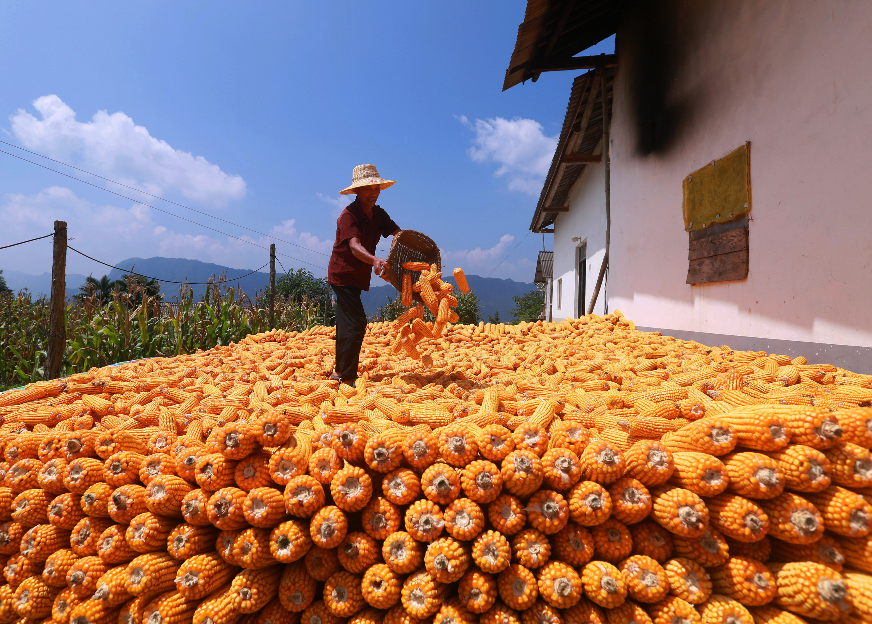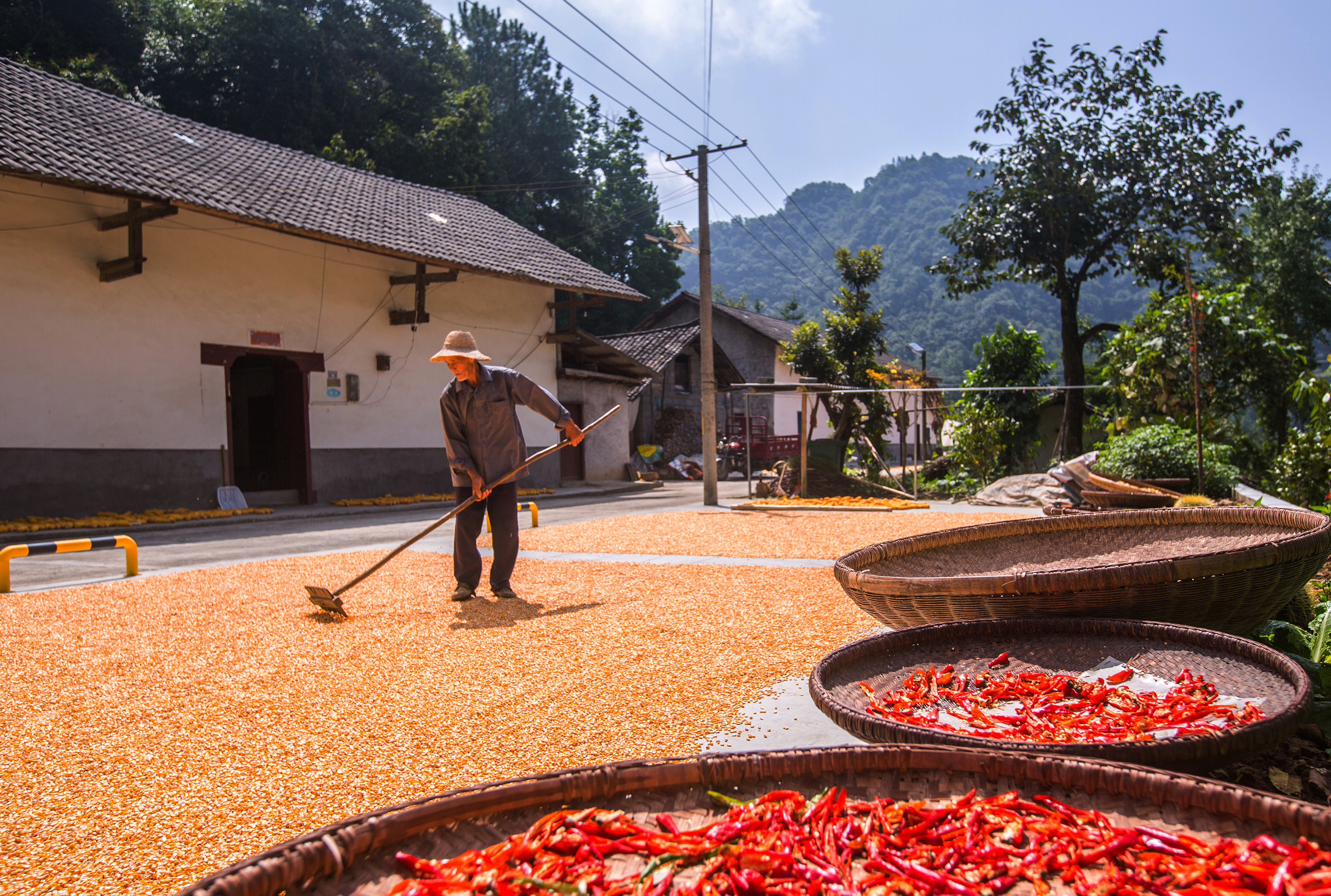 Farmers in Zigui County in China are currently drying golden corn and fiery red chili peppers in the sun, celebrating the bountiful autumn harvest. The yard is adorned with vibrant crops, portraying a picturesque countryside scene.